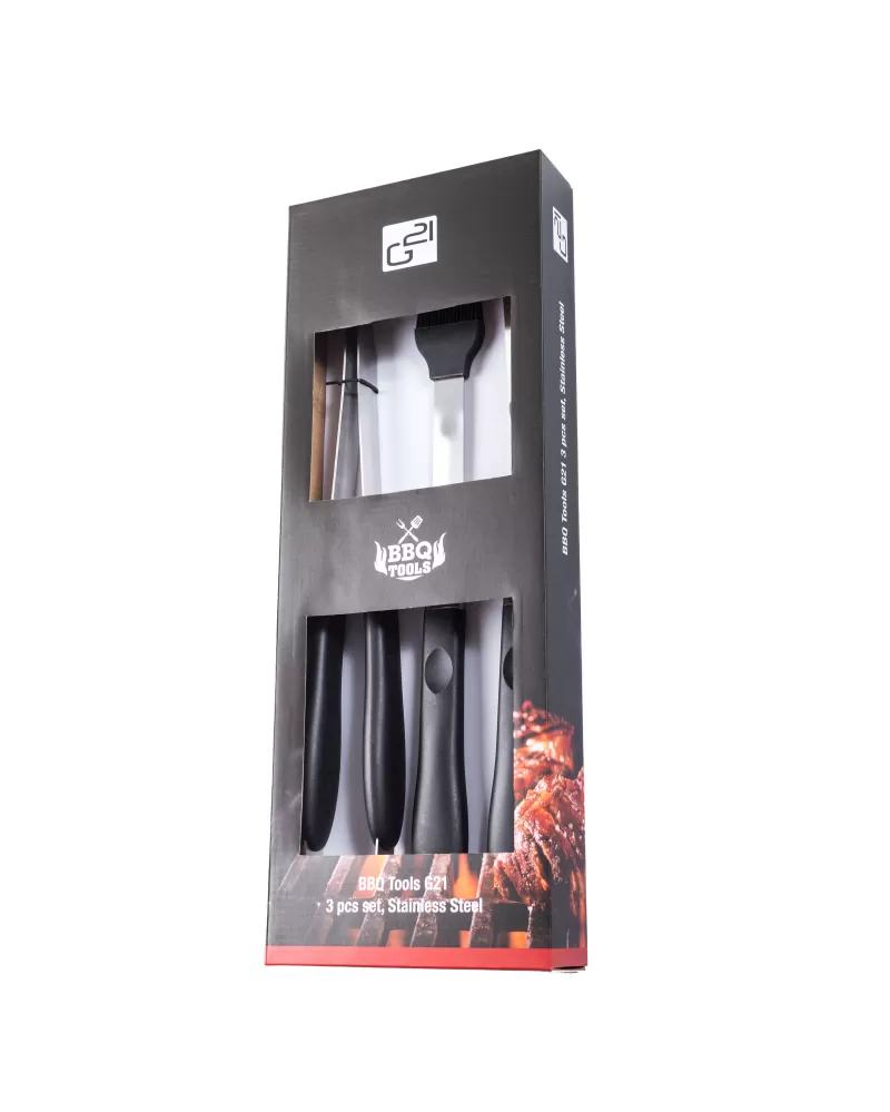 • Nerezové grilovací nářadí G21 se 3 kusy v sadě obsahuje marinovací štětec, grilovací vidličku a grilovací kleště.