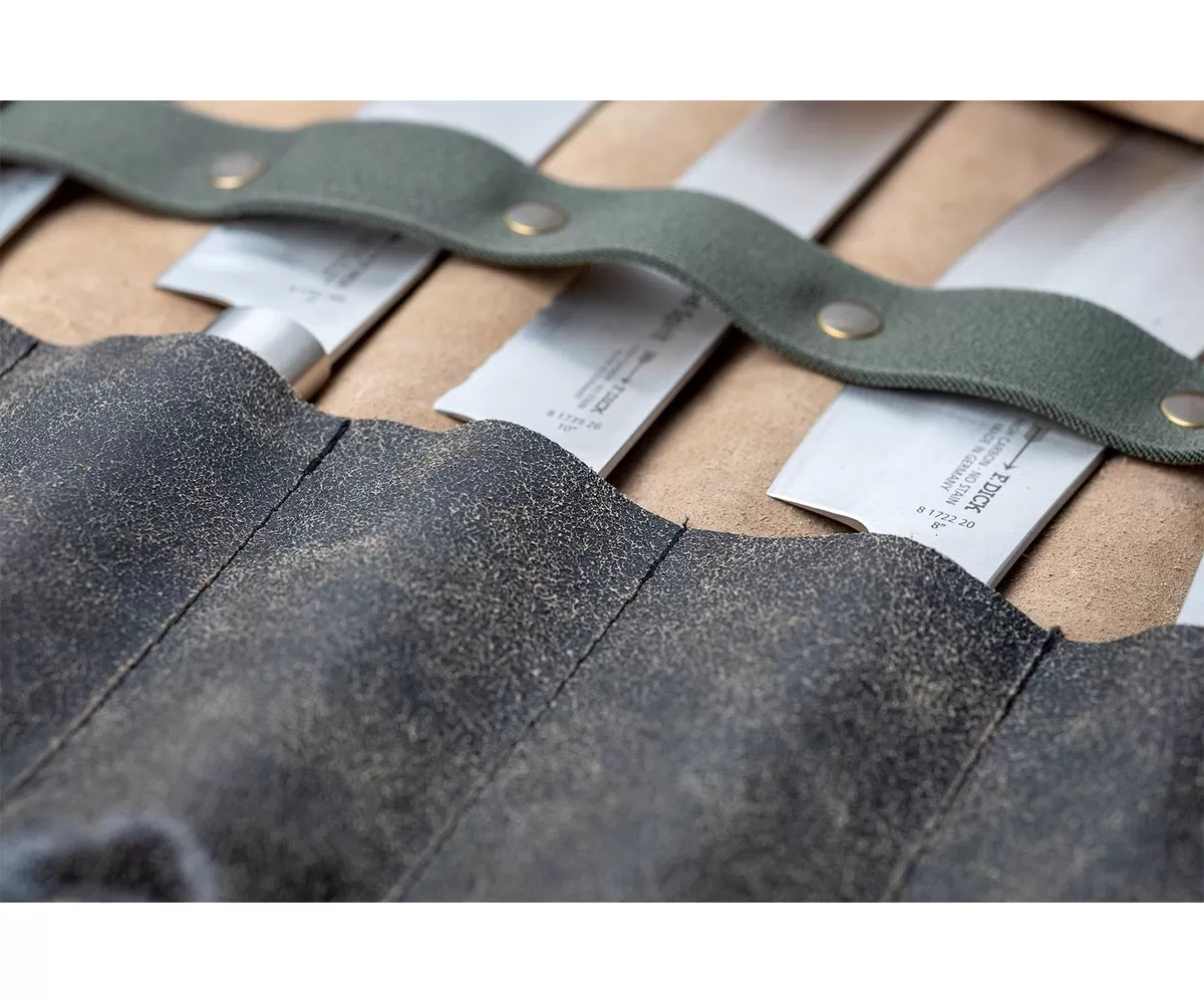 • Nože sú po vložení do púzdra fixované gumičkou s tlakom a následne potiahnuté kúskom kože, čo zabraňuje ich nežiaducemu pohybu a tuposti