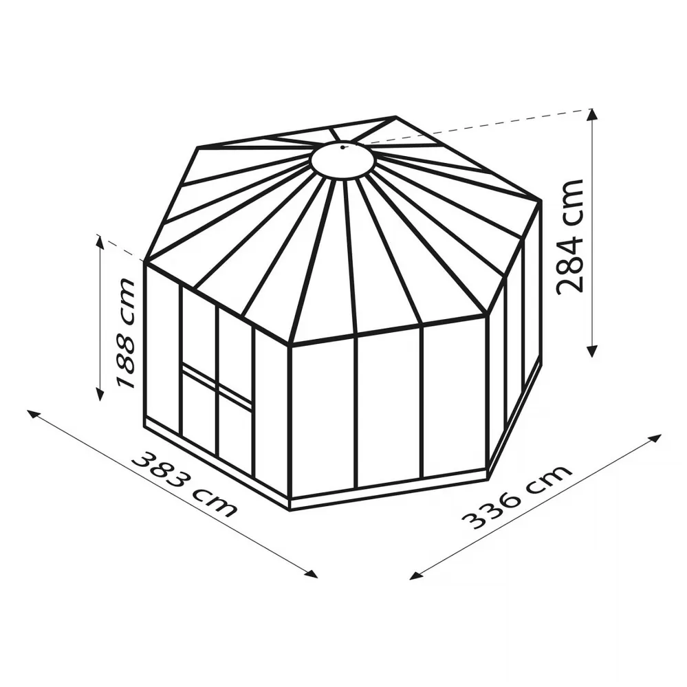 Hliníkový šestistěnný pavilon, průměr 3,20-3,80 m, bílá barva, kalené sklo 3 mm + střecha z polykarbonátu 6 mm.