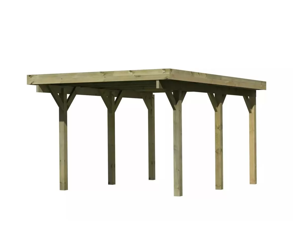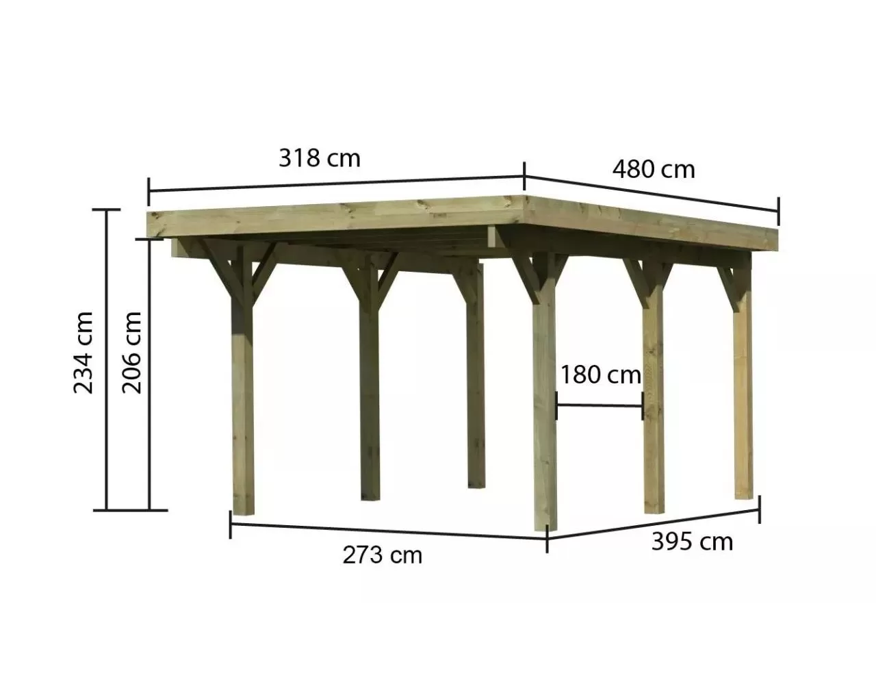 Přístřešek na auto - obdélníkový tvar a svými rozměry vyhovuje většině modelů vozidel běžných na českém trhu. Celková zastřešená plocha je 3,18 x 4,80 m. Průjezdná výška je 206 cm. Střechu podpírá šest dřevěných sloupků 11,5 x 11,5 cm. Konstrukce přístřešku je tlakově impregnována a je tak dobře chráněna proti dřevokazným houbám i hmyzu, ale i proti nepříznivým povětrnostním podmínkám. Impregnace je zdravotně nezávadná a naprosto bezpečná. Vzhledem k velkým plochám střechy a zatížení větrem je nutné připevnit přístřešek k zemi pomocí odpovídajících zemních kotev (nejsou obsahem dodávky - lze dokoupit jako příplatkové příslušenství).