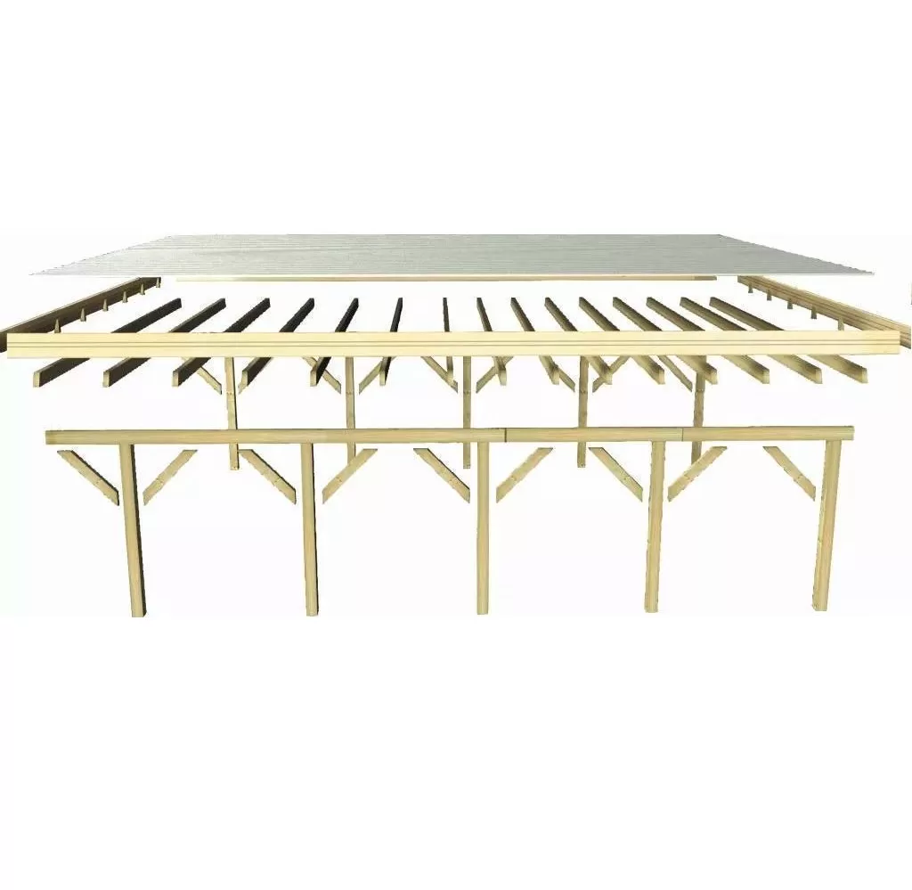 Dřevěný přístřešek na auto, š 563 x d 394 x v 206 cm, zastavěná plocha 22,18 m2 ocelové střešní plechy síly 0,5