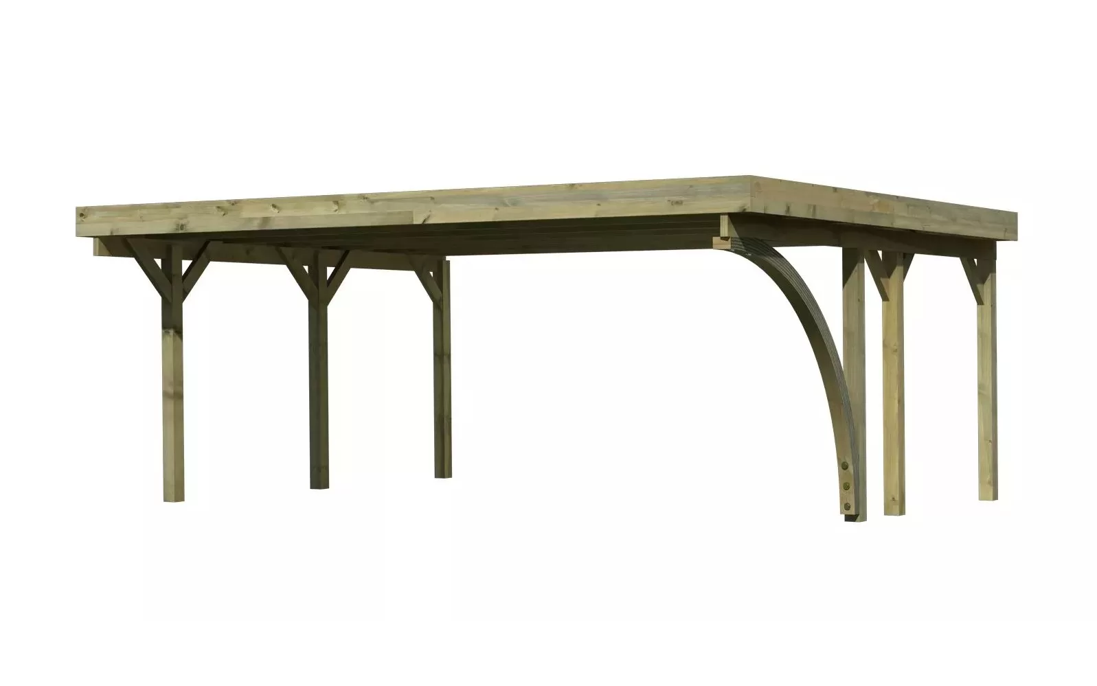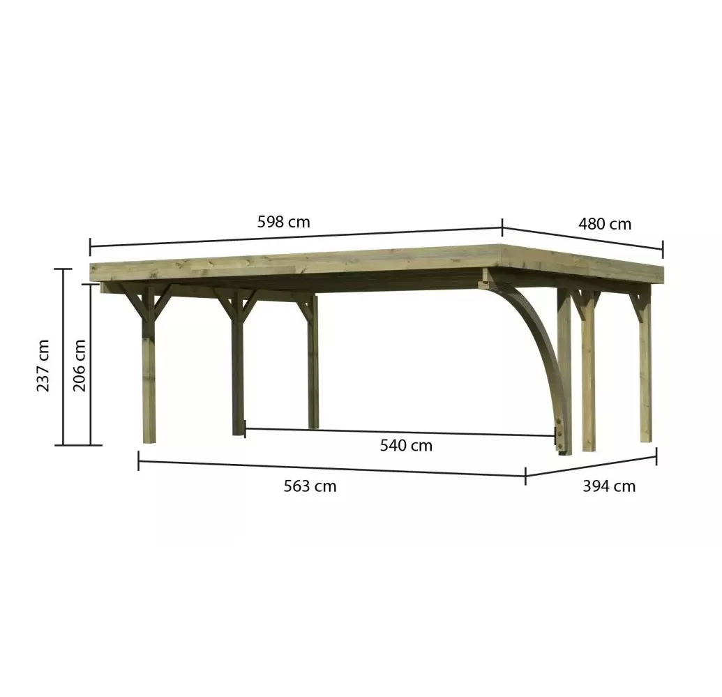Přístřešek na auto - obdélníkový tvar a svými rozměry vyhovuje většině modelů vozidel běžných na českém trhu. Celková zastřešená plocha je 5,98 x 4,80 m. Průjezdná výška je 206 cm. Střechu podpírá šest dřevěných sloupků 11,5 x 11,5 cm. Konstrukce přístřešku je tlakově impregnována a je tak dobře chráněna proti dřevokazným houbám i hmyzu, ale i proti nepříznivým povětrnostním podmínkám. Impregnace je zdravotně nezávadná a naprosto bezpečná. Vzhledem k velkým plochám střechy a zatížení větrem je nutné připevnit přístřešek k zemi pomocí odpovídajících zemních kotev (nejsou obsahem dodávky - lze dokoupit jako příplatkové příslušenství).