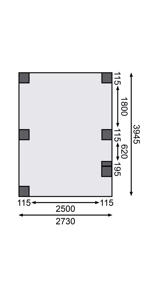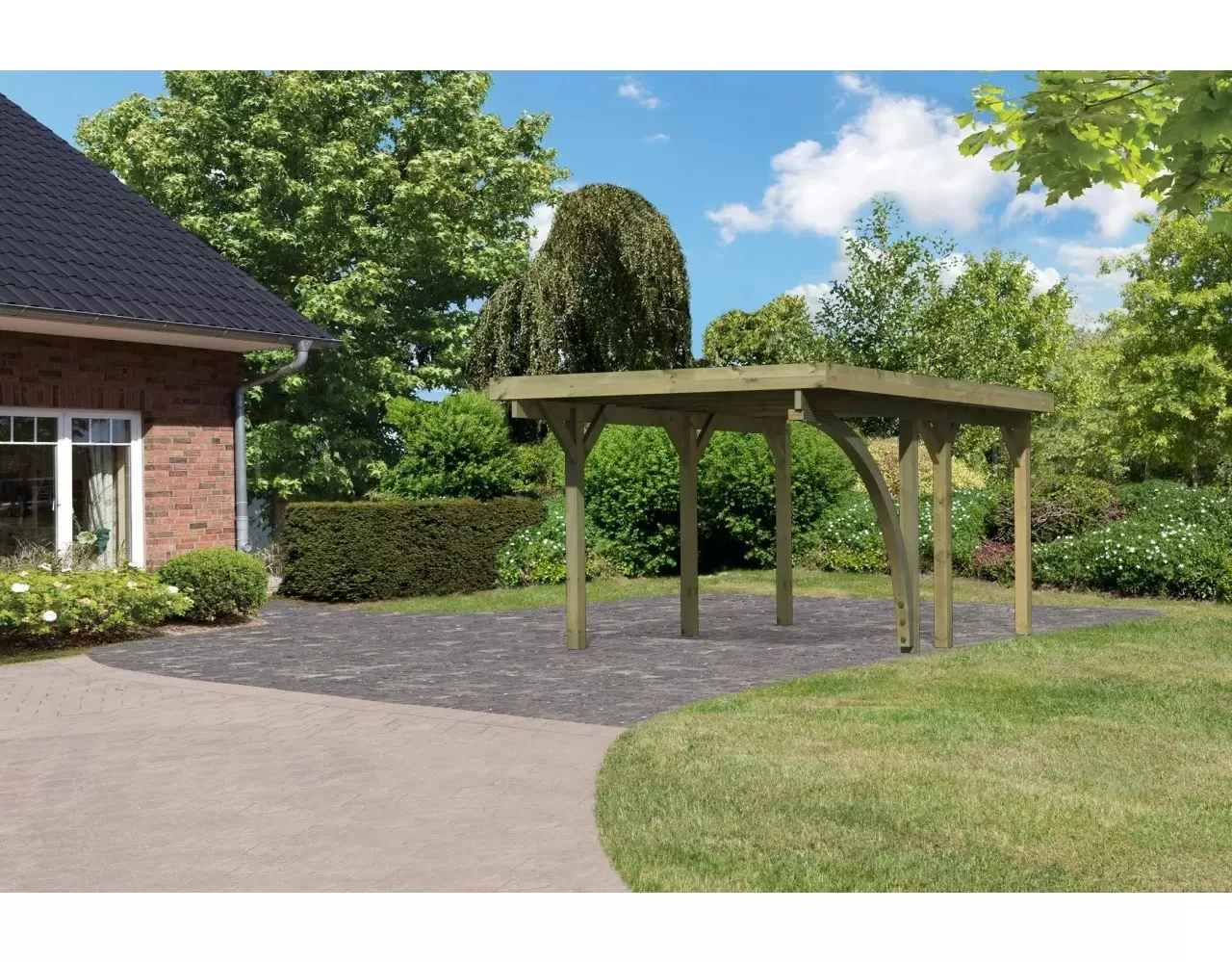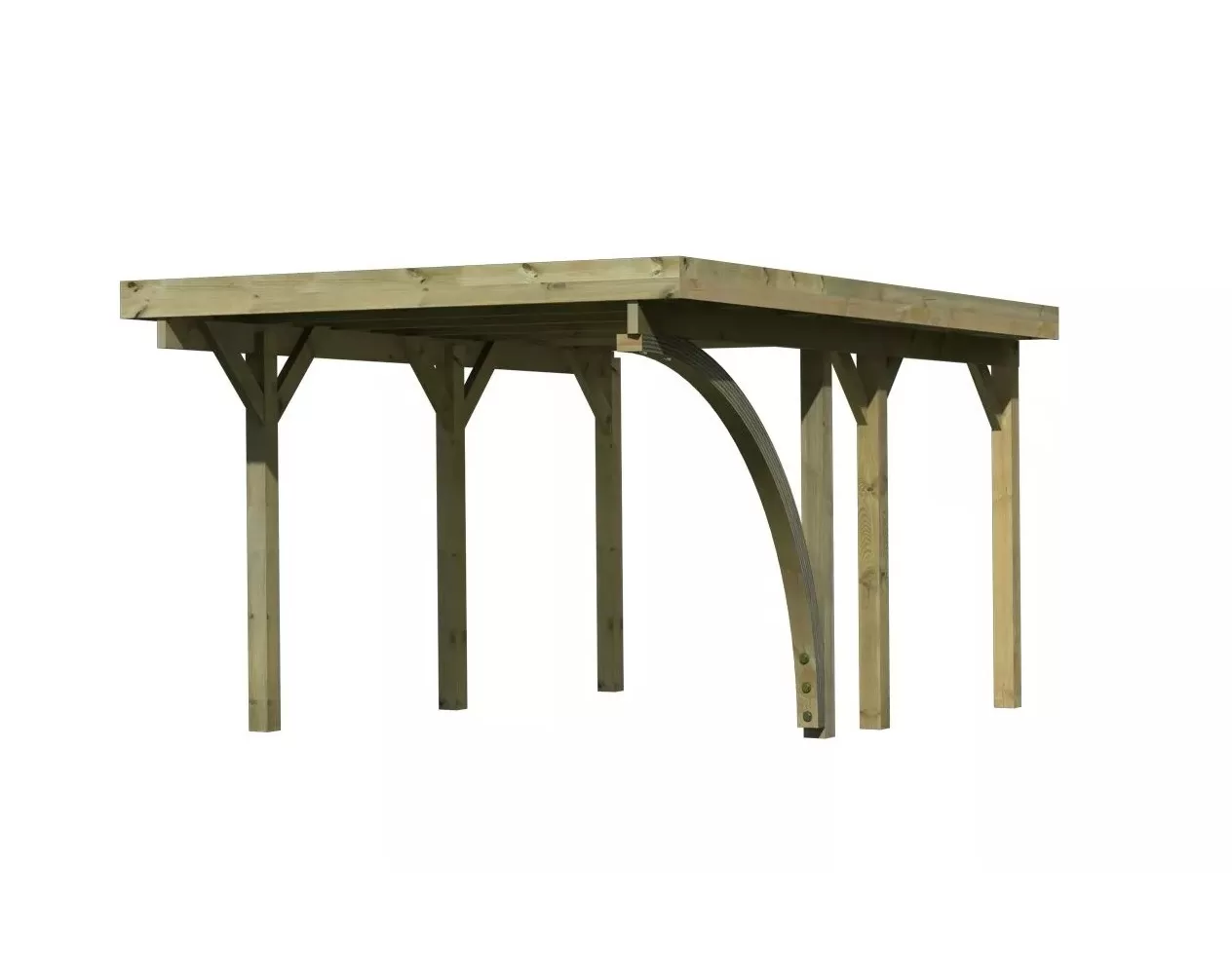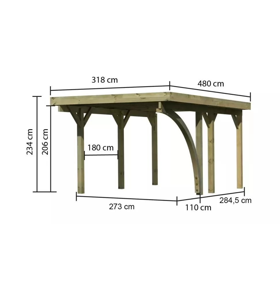 Přístřešek na auto - obdélníkový tvar a svými rozměry vyhovuje většině modelů vozidel běžných na českém trhu. Celková zastřešená plocha je 3,18 x 4,80 m. Průjezdná výška je 206 cm. Střechu podpírá šest dřevěných sloupků 11,5 x 11,5 cm. Konstrukce přístřešku je tlakově impregnována a je tak dobře chráněna proti dřevokazným houbám i hmyzu, ale i proti nepříznivým povětrnostním podmínkám. Impregnace je zdravotně nezávadná a naprosto bezpečná. Vzhledem k velkým plochám střechy a zatížení větrem je nutné připevnit přístřešek k zemi pomocí odpovídajících zemních kotev (nejsou obsahem dodávky - lze dokoupit jako příplatkové příslušenství).
