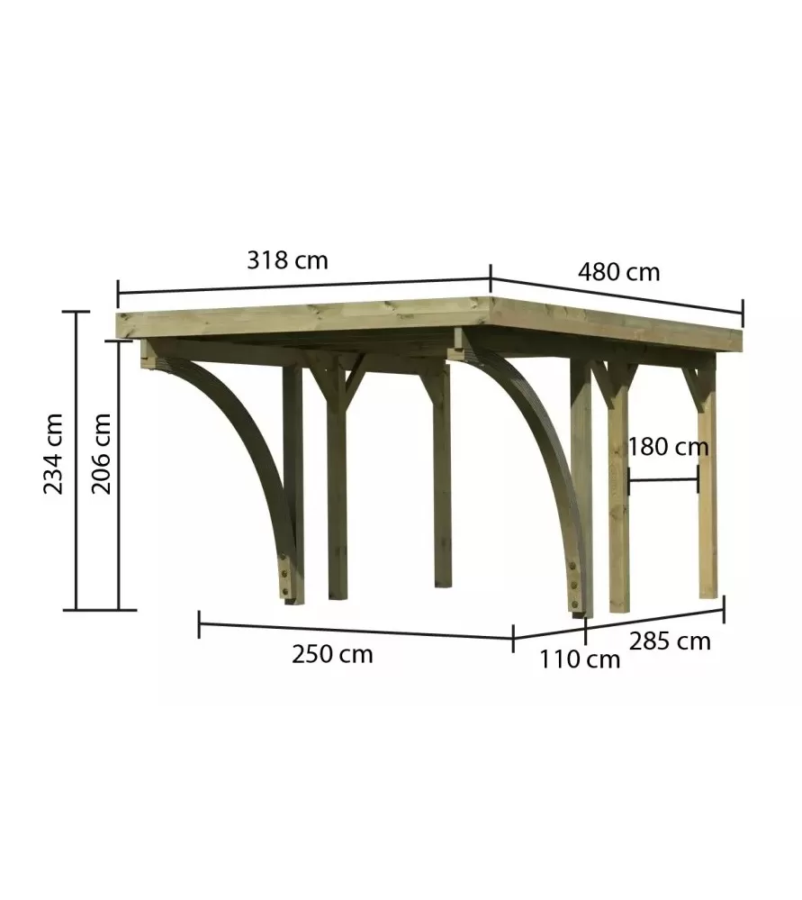Přístřešek na auto - obdélníkový tvar a svými rozměry vyhovuje většině modelů vozidel běžných na českém trhu. Celková zastřešená plocha je 3,18 x 4,80 m. Průjezdná výška je 206 cm. Střechu podpírá šest dřevěných sloupků 11,5 x 11,5 cm. Konstrukce přístřešku je tlakově impregnována a je tak dobře chráněna proti dřevokazným houbám i hmyzu, ale i proti nepříznivým povětrnostním podmínkám. Impregnace je zdravotně nezávadná a naprosto bezpečná. Vzhledem k velkým plochám střechy a zatížení větrem je nutné připevnit přístřešek k zemi pomocí odpovídajících zemních kotev (nejsou obsahem dodávky - lze dokoupit jako příplatkové příslušenství).