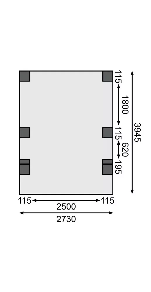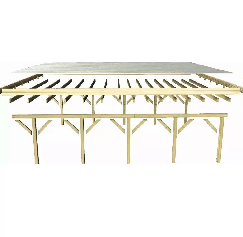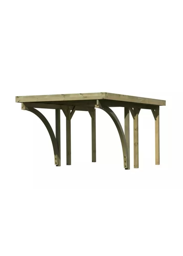 Přístřešek na auto - obdélníkový tvar a svými rozměry vyhovuje většině modelů vozidel běžných na českém trhu. Celková zastřešená plocha je 3,18 x 4,80 m. Průjezdná výška je 206 cm. Střechu podpírá šest dřevěných sloupků 11,5 x 11,5 cm. Konstrukce přístřešku je tlakově impregnována a je tak dobře chráněna proti dřevokazným houbám i hmyzu, ale i proti nepříznivým povětrnostním podmínkám. Impregnace je zdravotně nezávadná a naprosto bezpečná. Vzhledem k velkým plochám střechy a zatížení větrem je nutné připevnit přístřešek k zemi pomocí odpovídajících zemních kotev (nejsou obsahem dodávky - lze dokoupit jako příplatkové příslušenství).