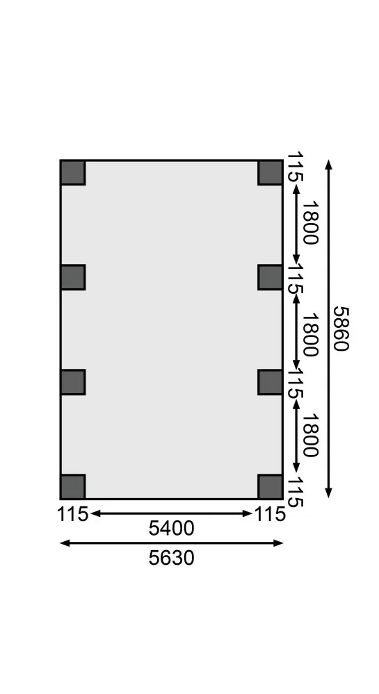 Přístřešek na auto - obdélníkový tvar a svými rozměry vyhovuje většině modelů vozidel běžných na českém trhu. Celková zastřešená plocha je 5,98 x 6,70 m. Průjezdná výška je 206 cm. Střechu podpírá osm dřevěných sloupků 11,5 x 11,5 cm. Konstrukce přístřešku je tlakově impregnována a je tak dobře chráněna proti dřevokazným houbám i hmyzu, ale i proti nepříznivým povětrnostním podmínkám. Impregnace je zdravotně nezávadná a naprosto bezpečná. Vzhledem k velkým plochám střechy a zatížení větrem je nutné připevnit přístřešek k zemi pomocí odpovídajících zemních kotev (nejsou obsahem dodávky - lze dokoupit jako příplatkové příslušenství).