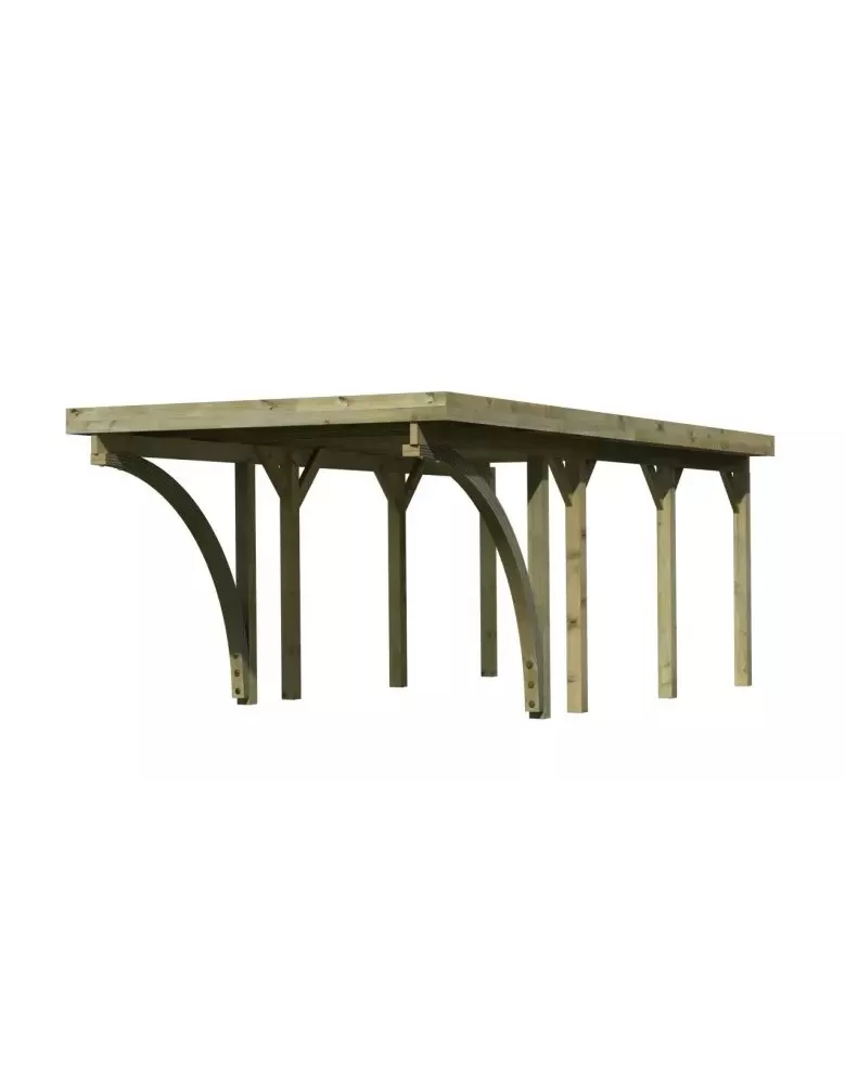 Přístřešek na auto - obdélníkový tvar a svými rozměry vyhovuje většině modelů vozidel běžných na českém trhu. Celková zastřešená plocha je 3,18 x 6,70 m. Průjezdná výška je 206 cm. Střechu podpírá osm dřevěných sloupků 11,5 x 11,5 cm. Konstrukce přístřešku je tlakově impregnována a je tak dobře chráněna proti dřevokazným houbám i hmyzu, ale i proti nepříznivým povětrnostním podmínkám. Impregnace je zdravotně nezávadná a naprosto bezpečná. Vzhledem k velkým plochám střechy a zatížení větrem je nutné připevnit přístřešek k zemi pomocí odpovídajících zemních kotev (nejsou obsahem dodávky - lze dokoupit jako příplatkové příslušenství).