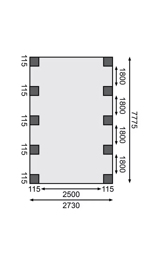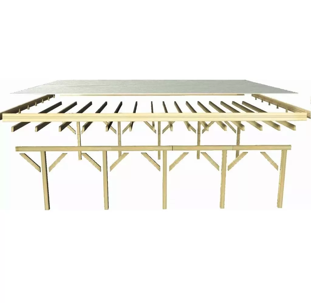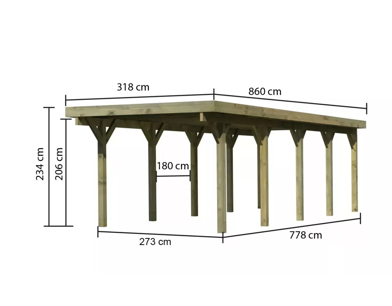 Přístřešek na auto - obdélníkový tvar a svými rozměry vyhovuje většině modelů vozidel běžných na českém trhu. Celková zastřešená plocha je 3,18 x 8,60 m. Průjezdná výška je 206 cm. Střechu podpírá deset dřevěných sloupků 11,5 x 11,5 cm. Konstrukce přístřešku je tlakově impregnována a je tak dobře chráněna proti dřevokazným houbám i hmyzu, ale i proti nepříznivým povětrnostním podmínkám. Impregnace je zdravotně nezávadná a naprosto bezpečná. Vzhledem k velkým plochám střechy a zatížení větrem je nutné připevnit přístřešek k zemi pomocí odpovídajících zemních kotev (nejsou obsahem dodávky - lze dokoupit jako příplatkové příslušenství).
