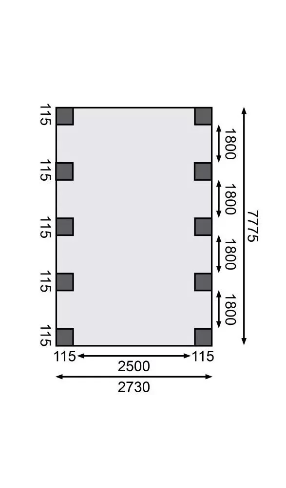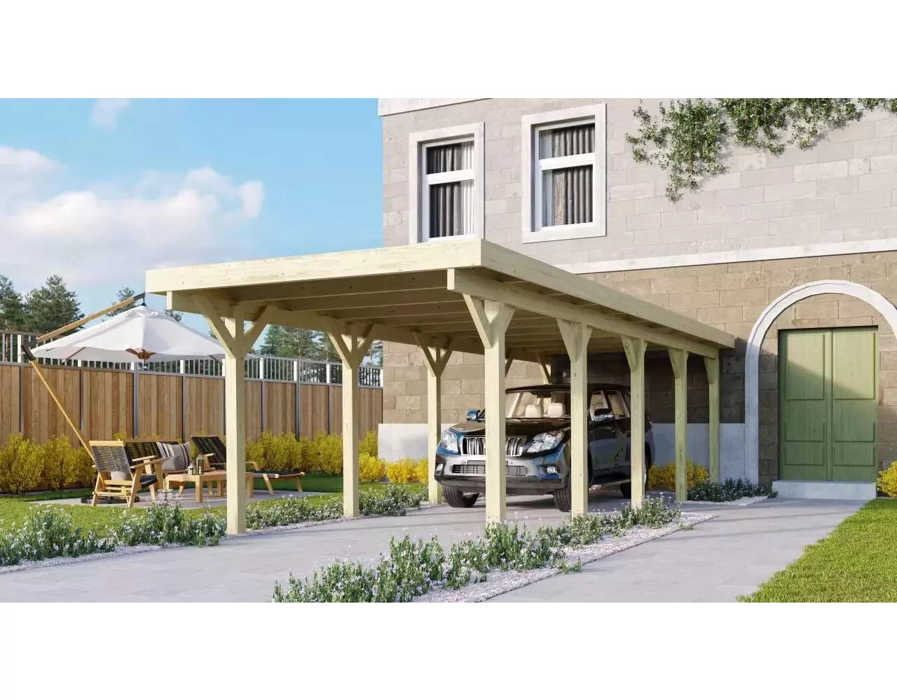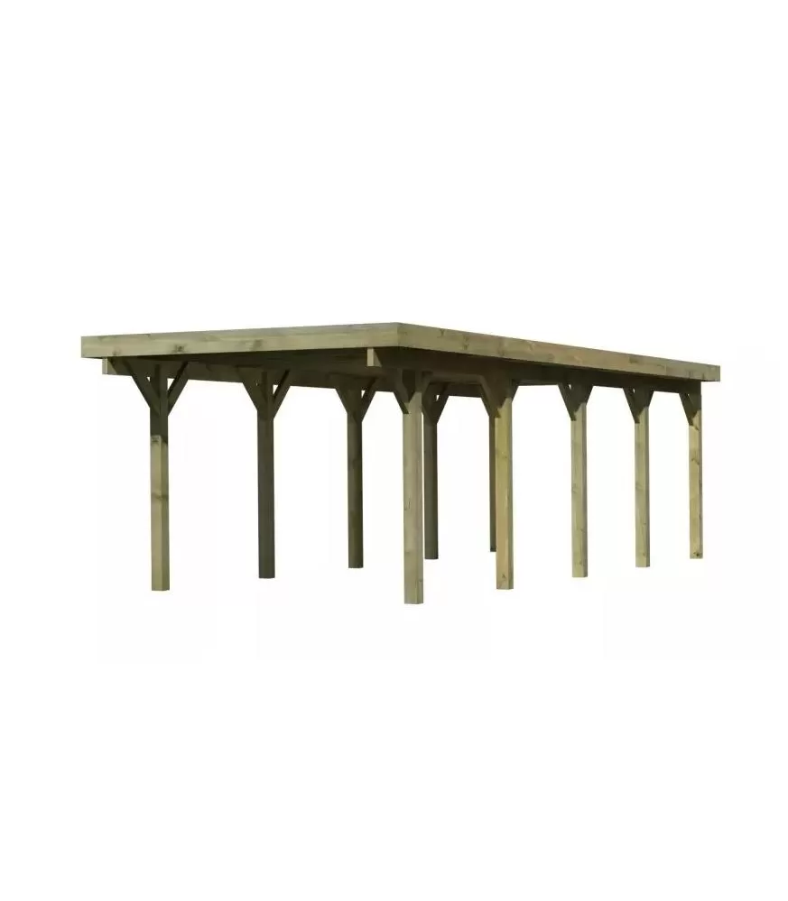 Přístřešek na auto - obdélníkový tvar a svými rozměry vyhovuje většině modelů vozidel běžných na českém trhu. Celková zastřešená plocha je 3,18 x 8,60 m. Průjezdná výška je 206 cm. Střechu podpírá deset dřevěných sloupků 11,5 x 11,5 cm. Konstrukce přístřešku je tlakově impregnována a je tak dobře chráněna proti dřevokazným houbám i hmyzu, ale i proti nepříznivým povětrnostním podmínkám. Impregnace je zdravotně nezávadná a naprosto bezpečná. Vzhledem k velkým plochám střechy a zatížení větrem je nutné připevnit přístřešek k zemi pomocí odpovídajících zemních kotev (nejsou obsahem dodávky - lze dokoupit jako příplatkové příslušenství).
