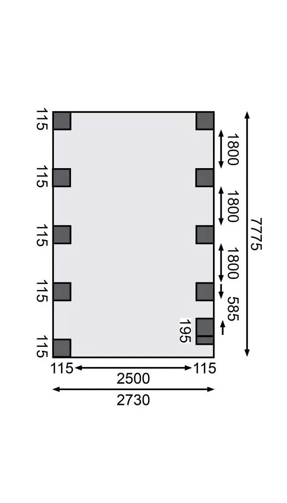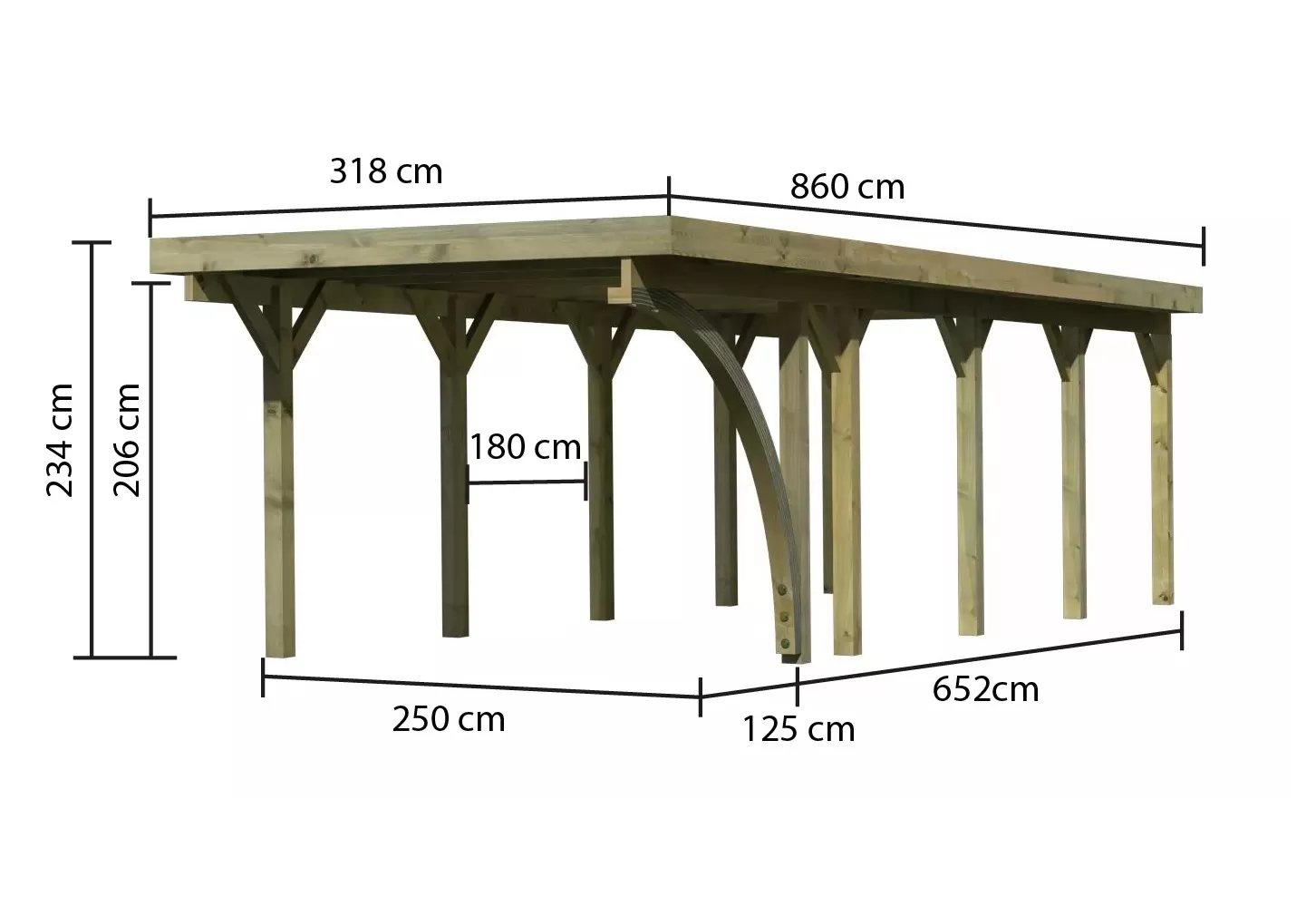 Přístřešek na auto - obdélníkový tvar a svými rozměry vyhovuje většině modelů vozidel běžných na českém trhu. Celková zastřešená plocha je 3,18 x 8,60 m. Průjezdná výška je 206 cm. Střechu podpírá deset dřevěných sloupků 11,5 x 11,5 cm. Konstrukce přístřešku je tlakově impregnována a je tak dobře chráněna proti dřevokazným houbám i hmyzu, ale i proti nepříznivým povětrnostním podmínkám. Impregnace je zdravotně nezávadná a naprosto bezpečná. Vzhledem k velkým plochám střechy a zatížení větrem je nutné připevnit přístřešek k zemi pomocí odpovídajících zemních kotev (nejsou obsahem dodávky - lze dokoupit jako příplatkové příslušenství).