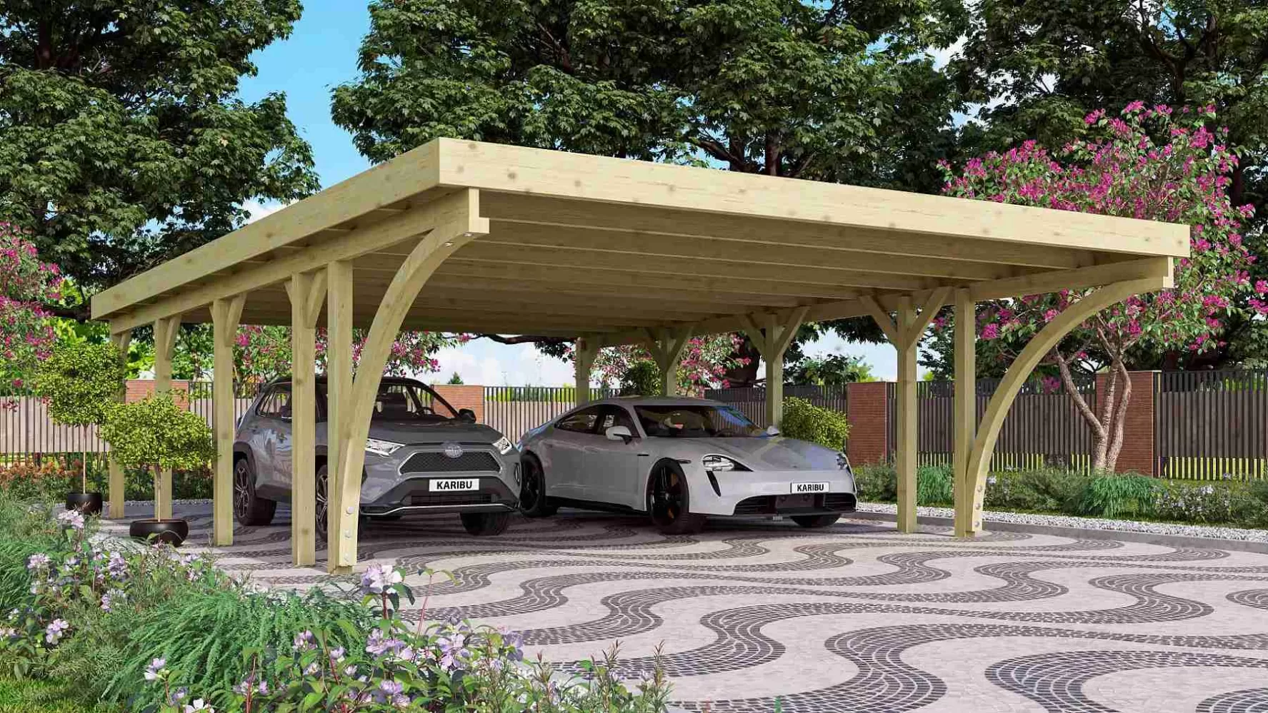 Tento model přístřešku obsahuje dva vjezdové oblouky, které výrazně ulehčují vjezd pod přístřešek z obou stran.