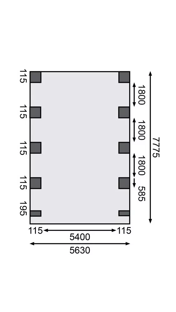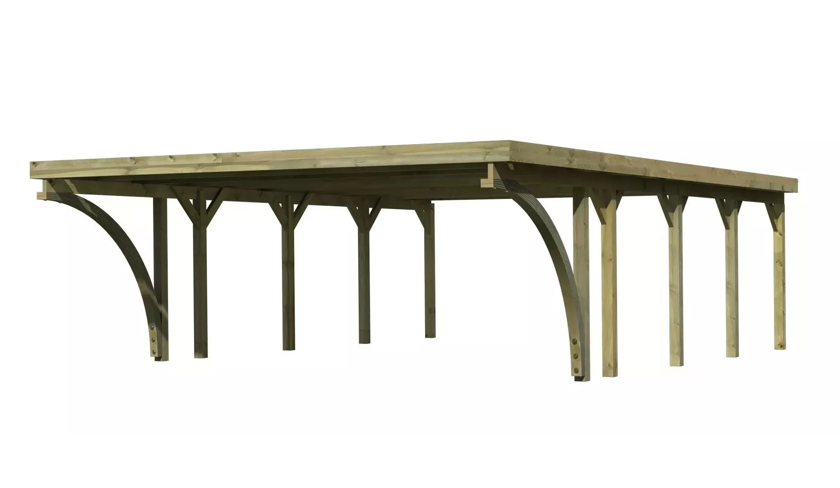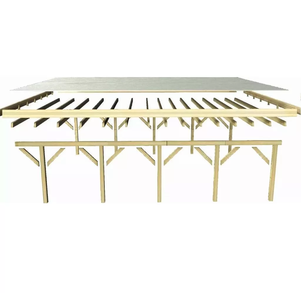 Přístřešek na auto - obdélníkový tvar a svými rozměry vyhovuje většině modelů vozidel běžných na českém trhu. Celková zastřešená plocha je 5,98 x 8,60 m. Průjezdná výška je 206 cm. Střechu podpírá deset dřevěných sloupků 11,5 x 11,5 cm. Konstrukce přístřešku je tlakově impregnována a je tak dobře chráněna proti dřevokazným houbám i hmyzu, ale i proti nepříznivým povětrnostním podmínkám. Impregnace je zdravotně nezávadná a naprosto bezpečná. Vzhledem k velkým plochám střechy a zatížení větrem je nutné připevnit přístřešek k zemi pomocí odpovídajících zemních kotev (nejsou obsahem dodávky - lze dokoupit jako příplatkové příslušenství).