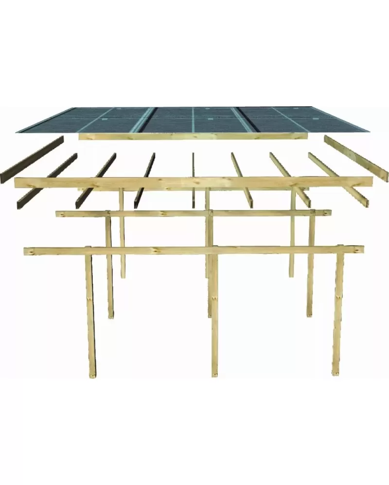 • Přístřešek má obdélníkový tvar a svými rozměry vyhovuje většině modelů vozidel běžných na českém trhu. Celková zastřešená plocha je 5,63 x 6,76 m. Průjezdná výška je 206 cm. Střechu podpírá šest dřevěných sloupků 9 x 9 cm. Konstrukce přístřešku je tlakově impregnována a je tak dobře chráněna proti dřevokazným houbám i hmyzu, ale i proti nepříznivým povětrnostním podmínkám. Impregnace je zdravotně nezávadná a naprosto bezpečná. Vzhledem k velkým plochám střechy a zatížení větrem je nutné připevnit přístřešek k zemi pomocí odpovídajících zemních kotev (nejsou obsahem dodávky - lze dokoupit jako příplatkové příslušenství).