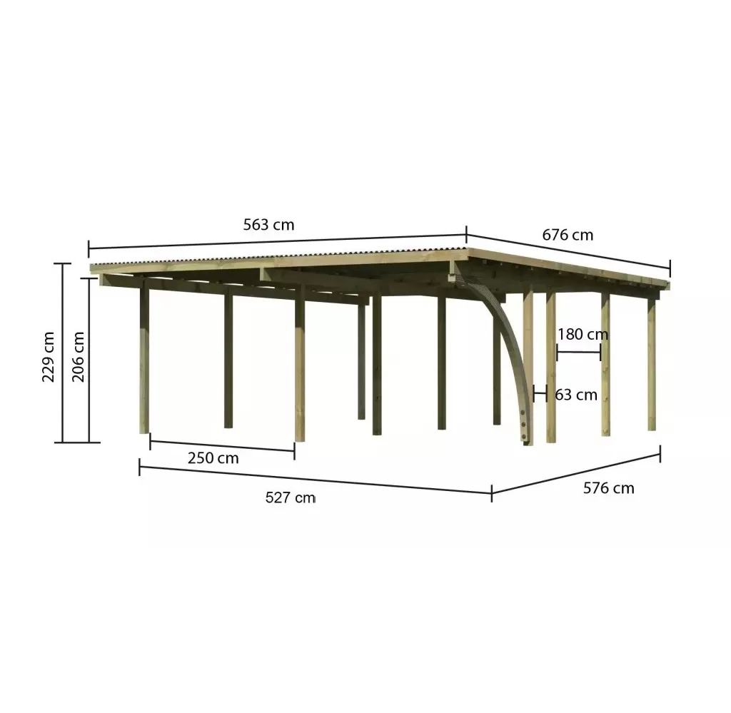 Přístřešek má obdélníkový tvar a svými rozměry vyhovuje většině modelů vozidel běžných na českém trhu. Celková zastřešená plocha je 5,63 x 6,76 m. Průjezdná výška je 206 cm. Střechu podpírá dvanáct dřevěných sloupků 9 x 9 cm. Konstrukce přístřešku je tlakově impregnována a je tak dobře chráněna proti dřevokazným houbám i hmyzu, ale i proti nepříznivým povětrnostním podmínkám. Impregnace je zdravotně nezávadná a naprosto bezpečná. Vzhledem k velkým plochám střechy a zatížení větrem je nutné připevnit přístřešek k zemi pomocí odpovídajících zemních kotev (nejsou obsahem dodávky - lze dokoupit jako příplatkové příslušenství).