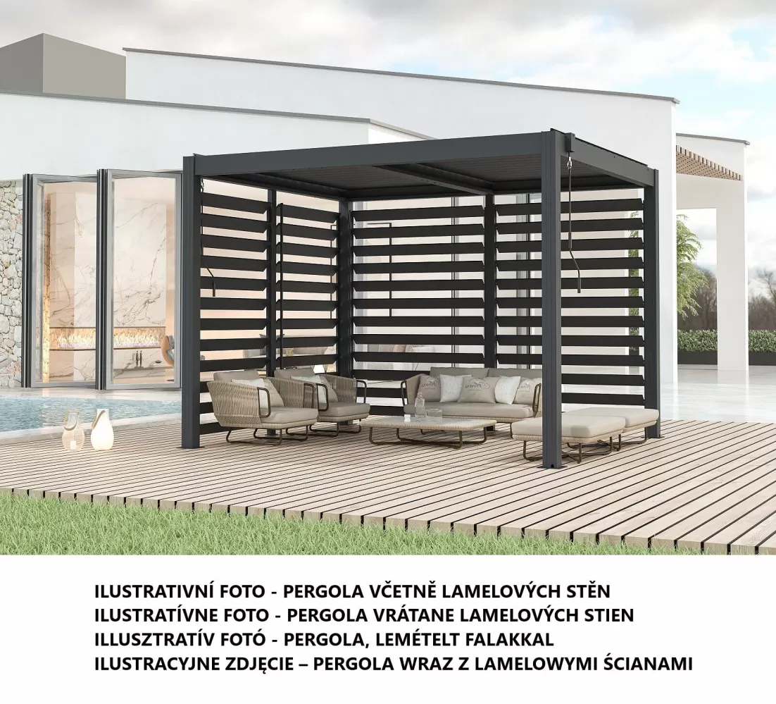 Základní verze bioklimatické pergoly LANITPLAST BIOCLIMATIC BASIC s vodorovnou lamelovou střechou a manuálním ovládáním střešních lamel. Jedná se o základní verzi pergoly, která má konstrukci z hliníku a střechu složenou z desítek otočných ocelových lamel. Lamely je možné manuálně klikou otáčet v úhlu 0 až 110o. Malá ruční klika ovládá mechanismus střechy, přičemž jejím otáčením umožňujete plynulé a synchronizované nastavení lamel. Každou stranu pergoly lze ovládat samostatně, což umožňuje individuální nastavení střešních lamel dle potřeby. Úhel natočení 90o zajistí zcela otevřenou střechu a úhel 0o zcela uzavřenou střechu. Konstrukce pergoly je vyrobená z odolné hliníkové slitiny a je nastříkaná práškovou vypalovanou barvou komaxit odstín antracit, a proto perfektně odolává přírodním klimatickým vlivům. Střešní lamely jsou vyrobené z ocelového profilu ošetřeného vypalovanou barvou komaxit ve stejném odstínu antracit.