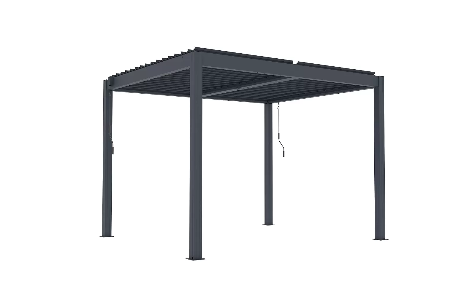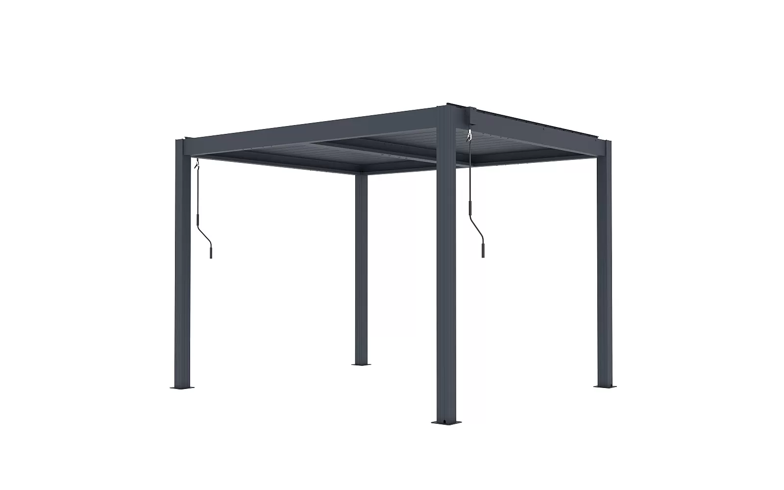 Základní verze hliníkové BIOKLIMATICKÉ pergoly, š 3,04 x d 2,59 x v 2,20 m, barva antracit, plochá manuálně ovládaná lamelová střecha.