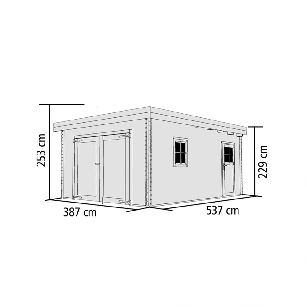 Dřevěná garáž, síla stěny 40 mm, rozměry š 387 x d 537 cm, zastavěná plocha 20,78 m2.