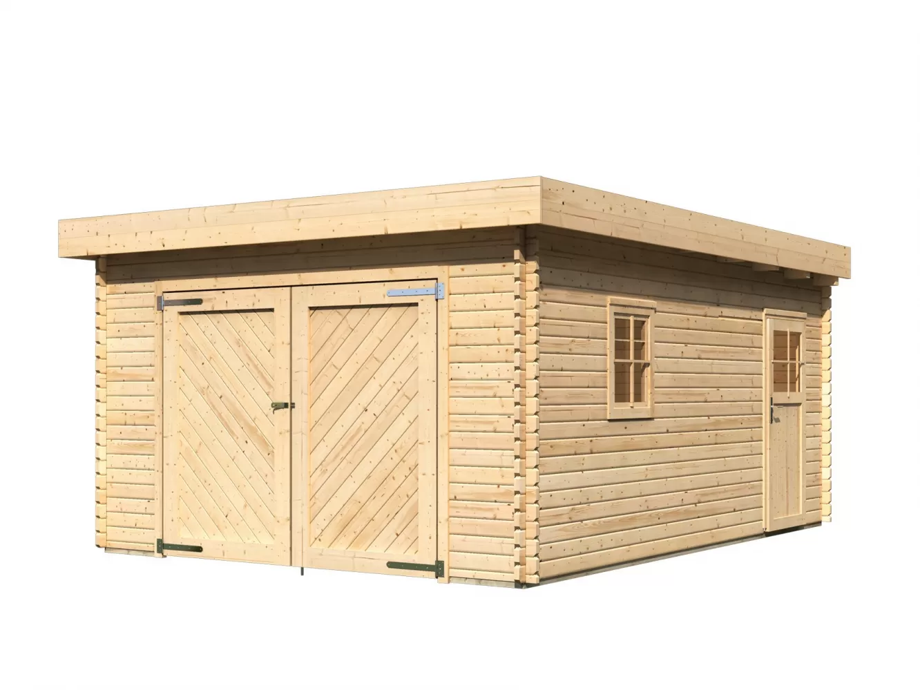 Garáž z přírodního dřeva pro středně velké vozidlo. S tloušťkou stěny 40 mm nabízí jistotu a stabilitu bytelné dřevostavby. Vjezd do garáže je zajištěn velkou dvoukřídlou dřevěnou branou š 238 x v 193 cm. Pokud tuto bránu dokořán otevřete, máte přístup k velkému interiéru o rozměrech š 365 x 514 cm. V boční stěně je možný vstup klasickými dveřmi š 82,5 x v 170 cm s přídavným okénkem. Pokud nechcete vyjíždět ven, ale pouze chcete do auta uložit věci, tak nemusíte otevírat velkou bránu, ale můžete využít menší dveře. Šikmá střecha z masivních dřevěných desek zajišťuje dlouhodobou ochranu proti povětrnostním vlivům.