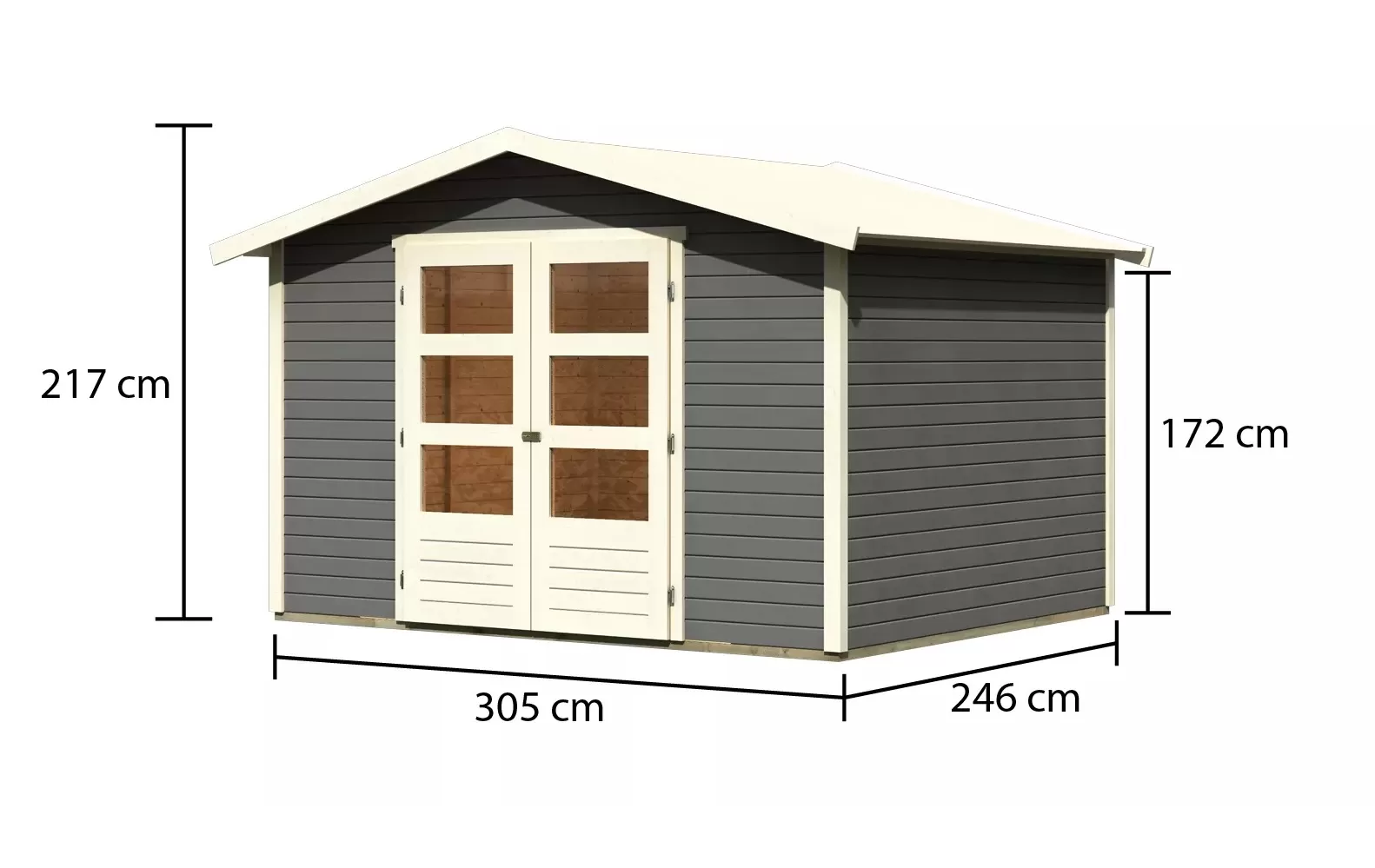 Dřevěný domek KARIBU AMBERG 5 (23601) terragrau LG3510 Dřevěný domek, síla stěny 19 mm, vnější rozměry š 305 x d 246 cm, vnější plocha domku 7,5… Celý popis