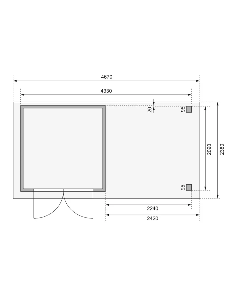 • Tato verze domku obsahuje otevřený přístavek délky 240 cm montovatelný zprava nebo zleva.