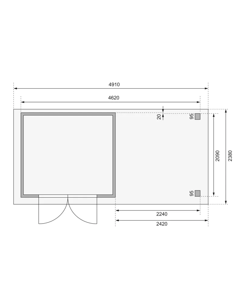 • Tato verze domku obsahuje i otevřený přístavek délky 240 cm montovatelný zprava nebo zleva.
