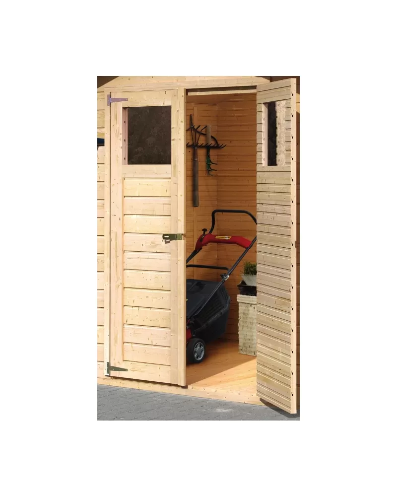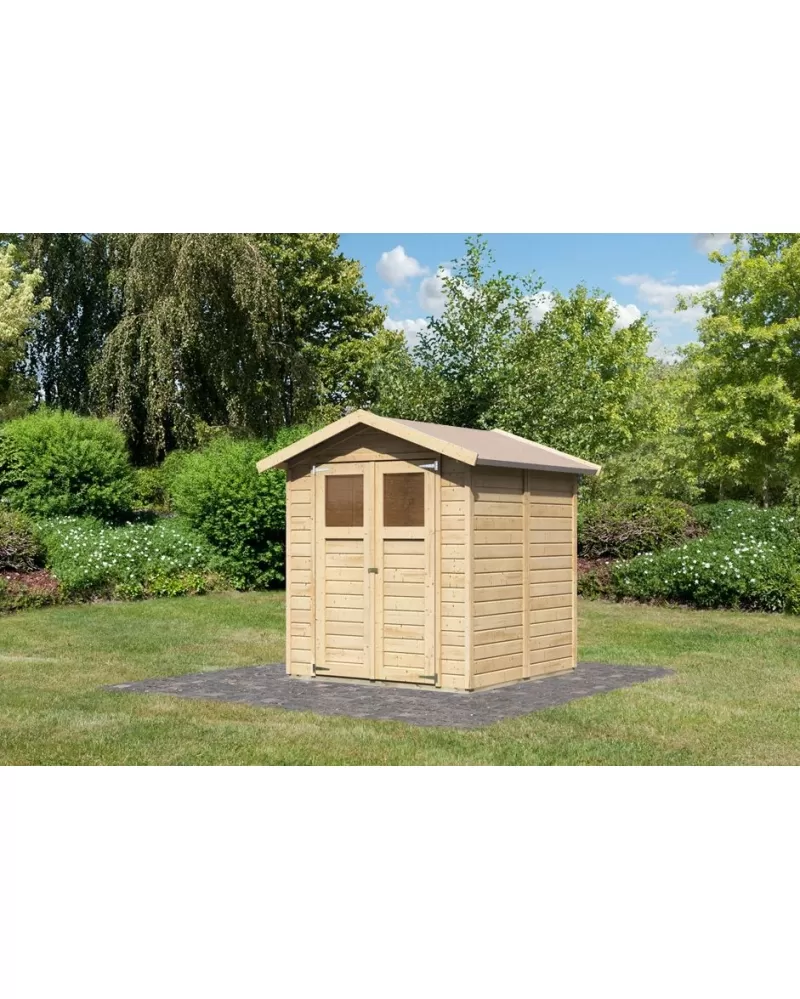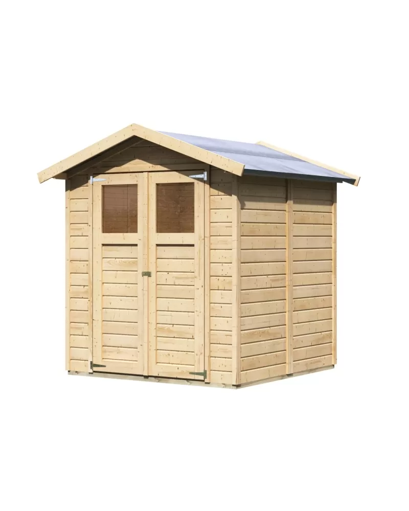 • Základní model dřevěného domku pro vaši zahradu. Tento model má sedlovou střechu a dvoukřídlé dveře na pantech s oknem v každém křídle. Stavebním materiálem domku jsou dřevěné profily síly 14 mm perfektně vyfrézované ze severského smrku. Dodáváme jako stavebnici v rozloženém stavu, kde stěny tvoří předpřipravené menší panely, které pouze sešroubujete k sobě a střechu tvoří celistvá deska. To garantuje extrémně jednoduchou montáž, kterou zvládne každý český kutil.