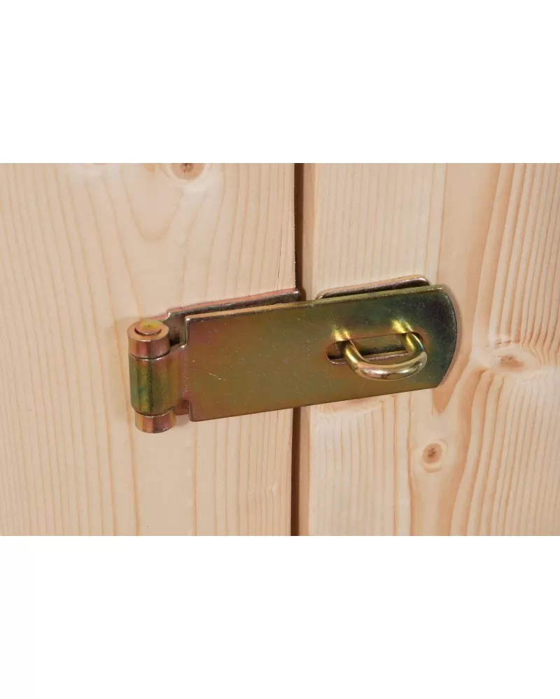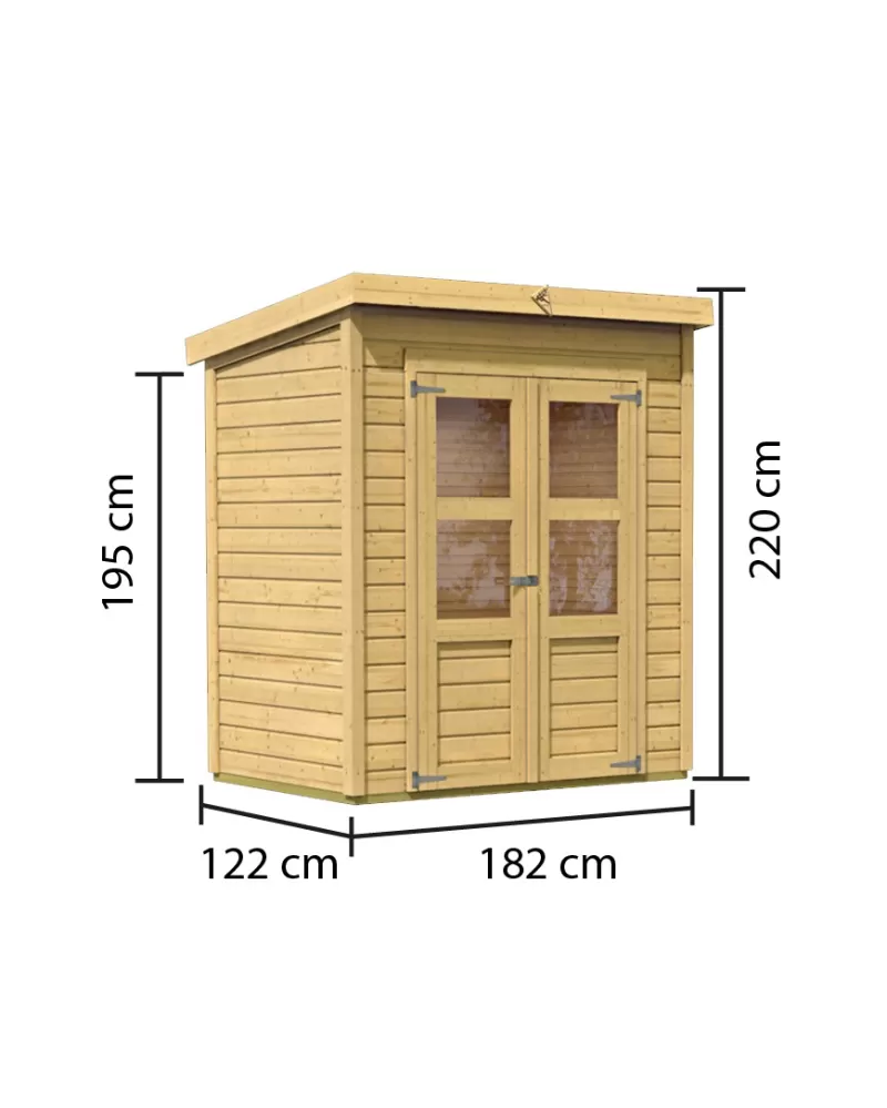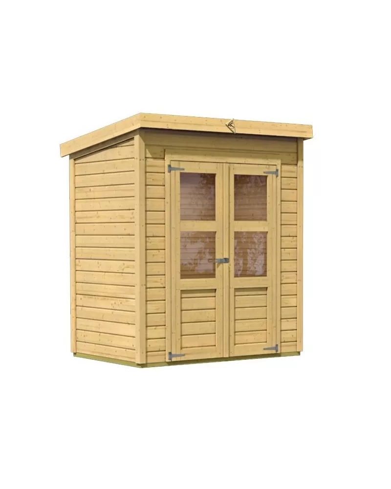 • Tento model má pultovou střechu a dvoukřídlé dveře na pantech s oknem v každém křídle.