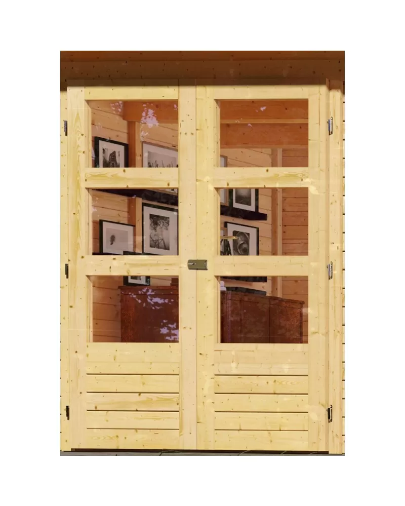 • Tento model má pultovou střechu a dvoukřídlé dveře na pantech s oknem v každém křídle.