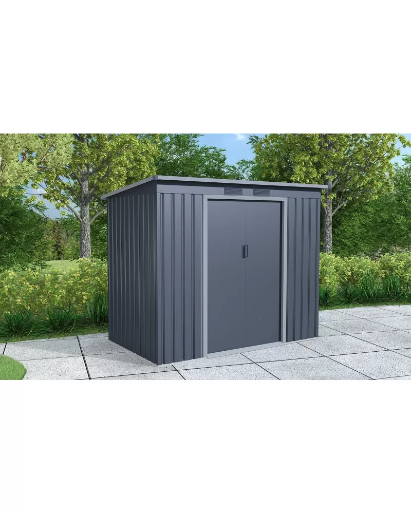 • Praktický a odolný kovový zahradní domek HALLE 74 od renomovaného výrobce LANIT PLAST, s.r.o. s pultovou střechou je ideálním úložištěm pro vaše zahrádkářské, sportovní, bazénové, grilovací, campingové nebo motoristické potřeby. Jeho konstrukce je vyrobena z pozinkovaného profilovaného plechu s vysokou pevností a tloušťkou stěny 0,22 - 0,35 mm, což zajišťuje odolnost a dlouhou životnost.