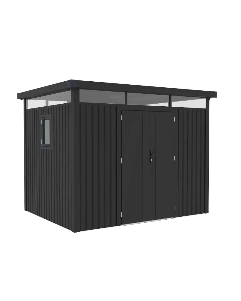 • Tato praktická konstrukce váží 199 kg a má antracitovou barvu, která se snadno začlení do každého venkovního prostředí. Plochá střecha a dvojité křídlové dveře o rozměrech š 106 x v 178 cm dodávají domku jednoduchý a moderní vzhled.