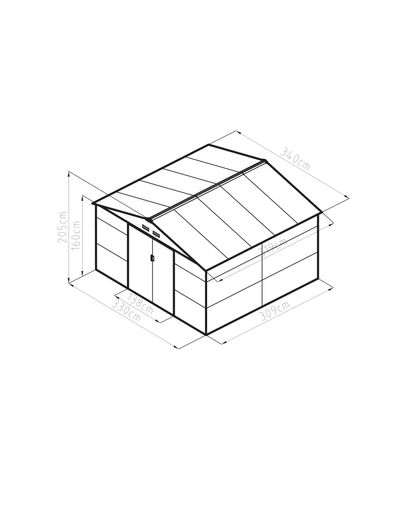 • Šířka přední strany činí 340 cm, výška v nejvyšším bodě je 205 cm a šířka boční strany je 319 cm. Výška boční stěny bez střechy je 163 cm. Na přední straně se nachází dveře.