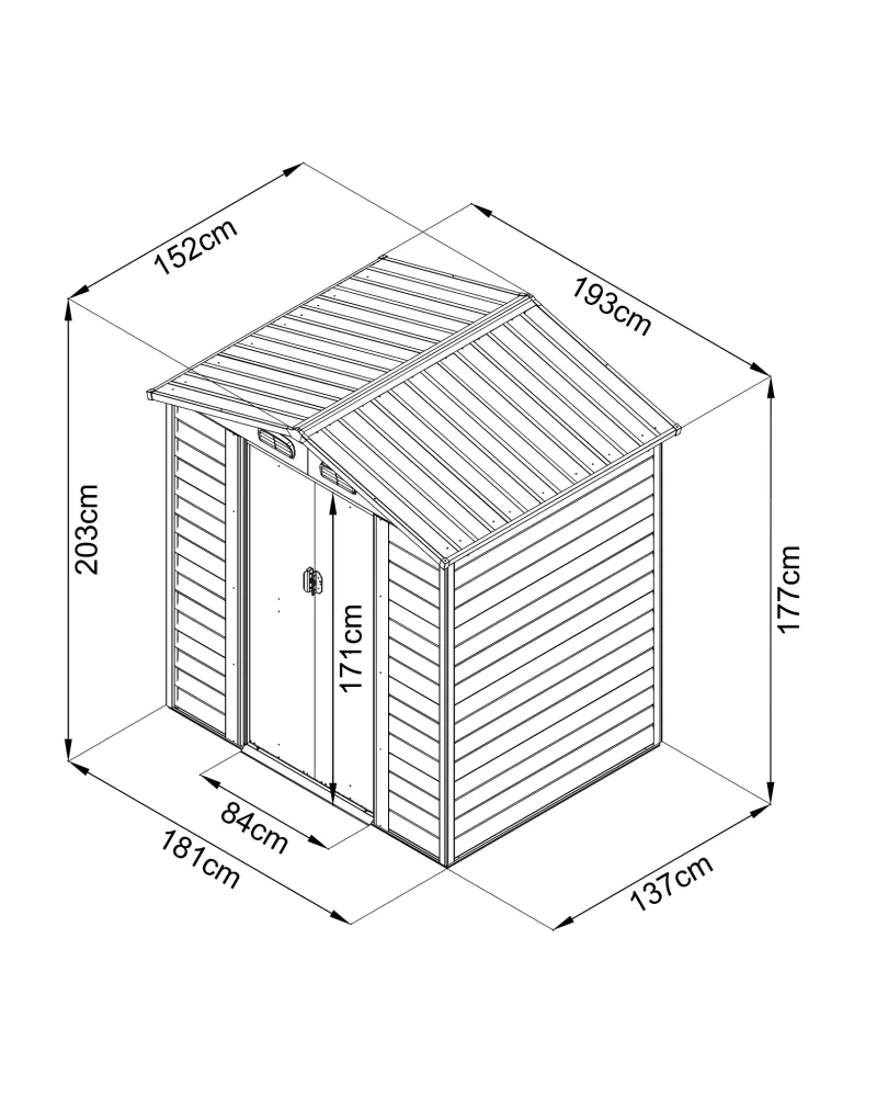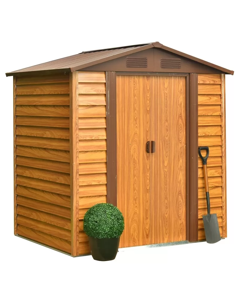 • Domek je vyrobený z pozinkovaného vodorovně profilovaného plechu a vzhledově (designově i barevně) se přibližuje dřevěnému domku. Domek je možné použít k uskladnění zahrádkářských, sportovních, bazénových, grilovacích, campingových, motoristických a dalších potřeb. Moderní design, barva, snadná montáž, celoroční použití. Kvalitní materiál s povrchovou úpravou - elektrolyticky pozinkovaný plech s žárově nanesenou barvou. Sedlová střecha, čelní posuvné dveře. Možnost uzamčení (zámek není obsahem dodávky).