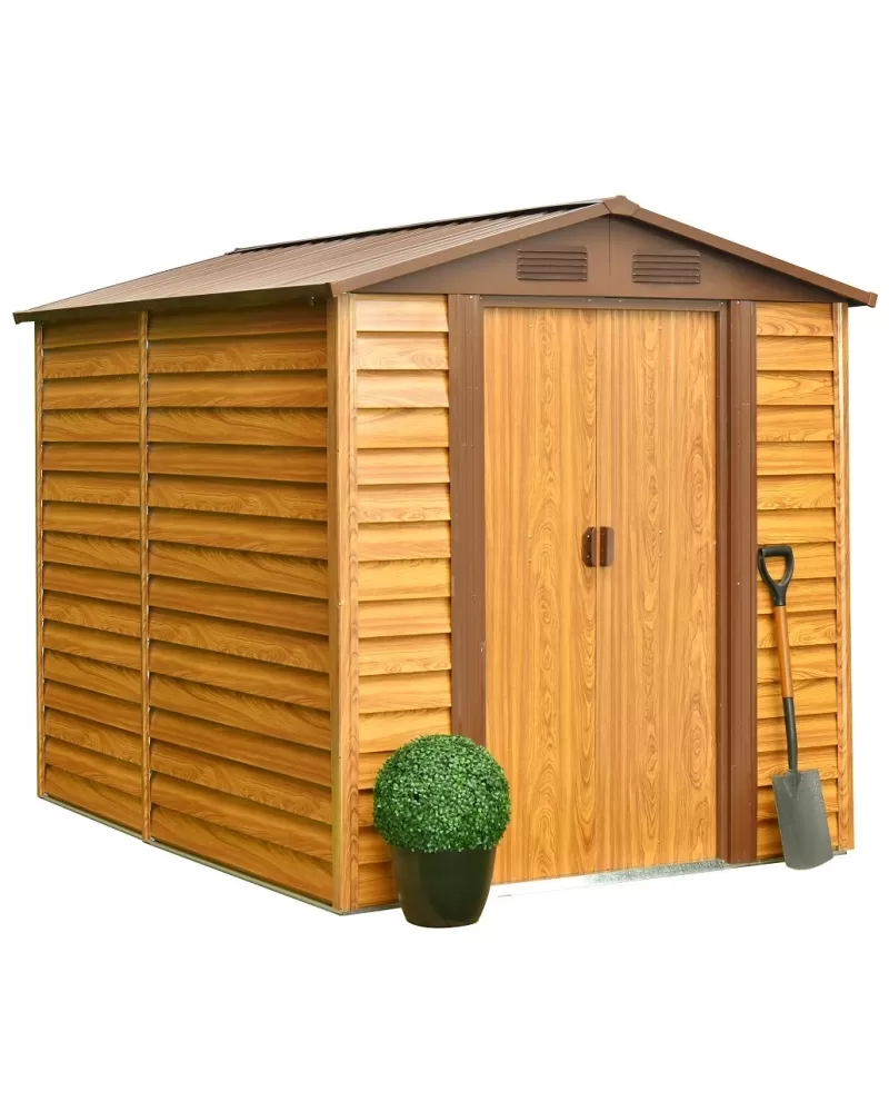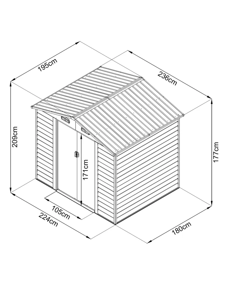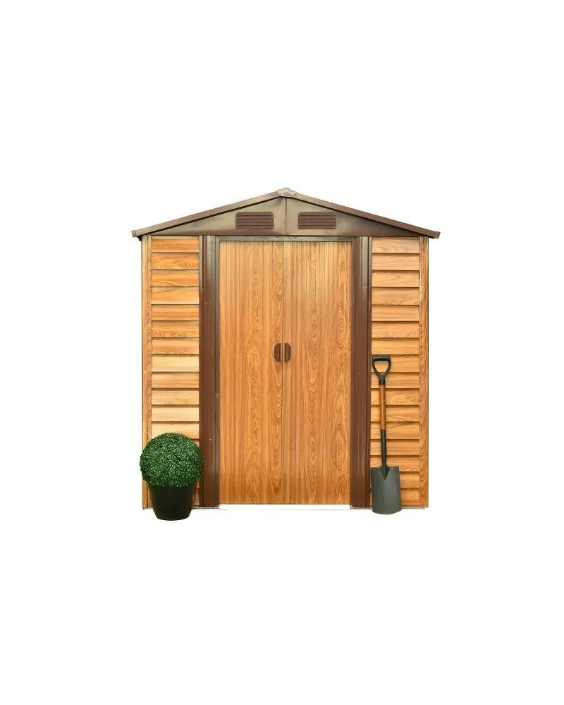 • Domek je vyrobený z pozinkovaného vodorovně profilovaného plechu a vzhledově (designově i barevně) se přibližuje dřevěnému domku. Domek je možné použít k uskladnění zahrádkářských, sportovních, bazénových, grilovacích, campingových, motoristických a dalších potřeb. Moderní design, barva, snadná montáž, celoroční použití. Kvalitní materiál s povrchovou úpravou - elektrolyticky pozinkovaný plech s žárově nanesenou barvou. Sedlová střecha, čelní posuvné dveře. Možnost uzamčení (zámek není obsahem dodávky).