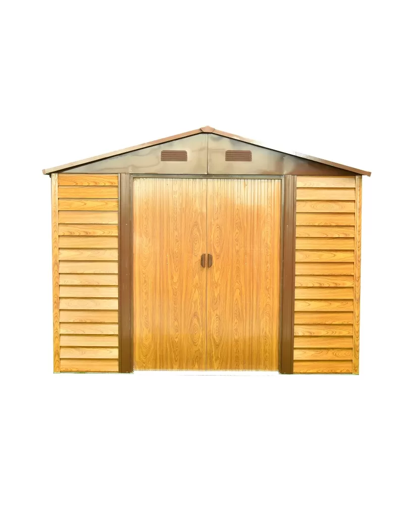 • Domek je vyrobený z pozinkovaného vodorovně profilovaného plechu a vzhledově (designově i barevně) se přibližuje dřevěnému domku. Domek je možné použít k uskladnění zahrádkářských, sportovních, bazénových, grilovacích, campingových, motoristických a dalších potřeb. Moderní design, barva, snadná montáž, celoroční použití. Kvalitní materiál s povrchovou úpravou - elektrolyticky pozinkovaný plech s žárově nanesenou barvou. Sedlová střecha, čelní posuvné dveře. Možnost uzamčení (zámek není obsahem dodávky).
