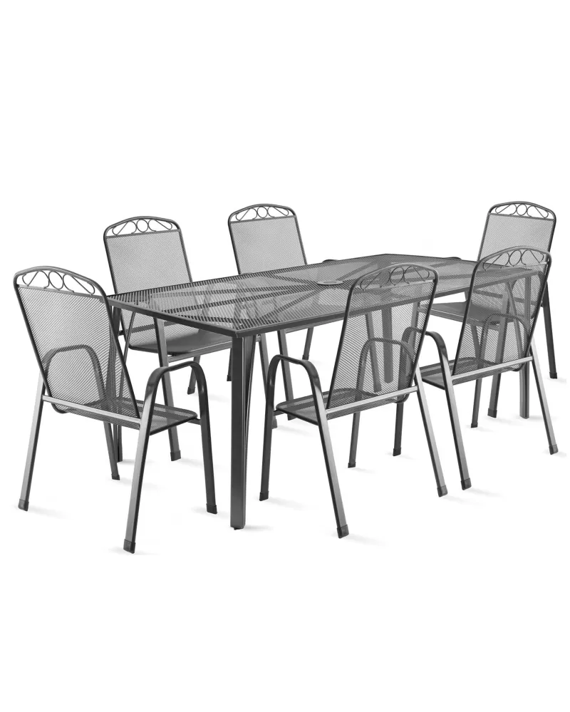 • Sestava je složena ze 6 křesel s drátěnou výplní a zahradní stolu s drátěnou deskou