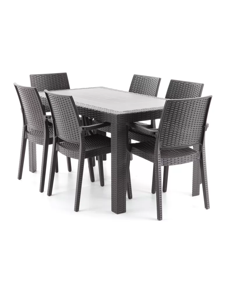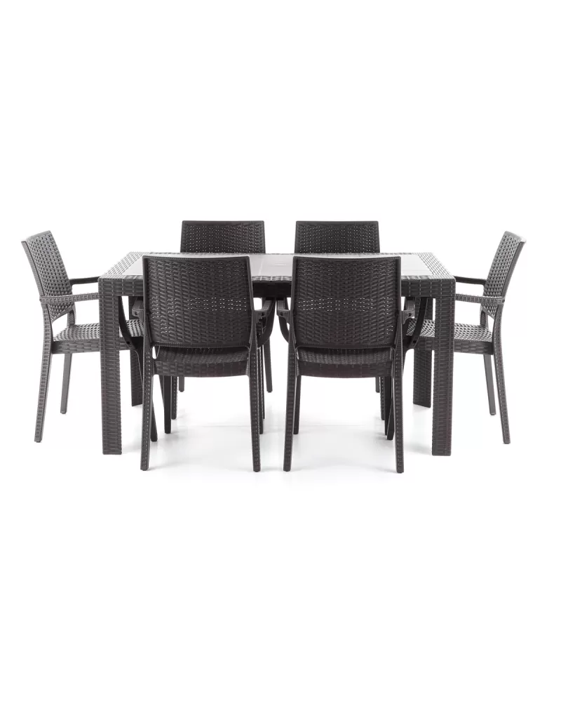 • Stolová sestava se skládá z 6-ti pohodlných masivně vyztužených křesel v imitaci umělého ratanu s UV filtrem