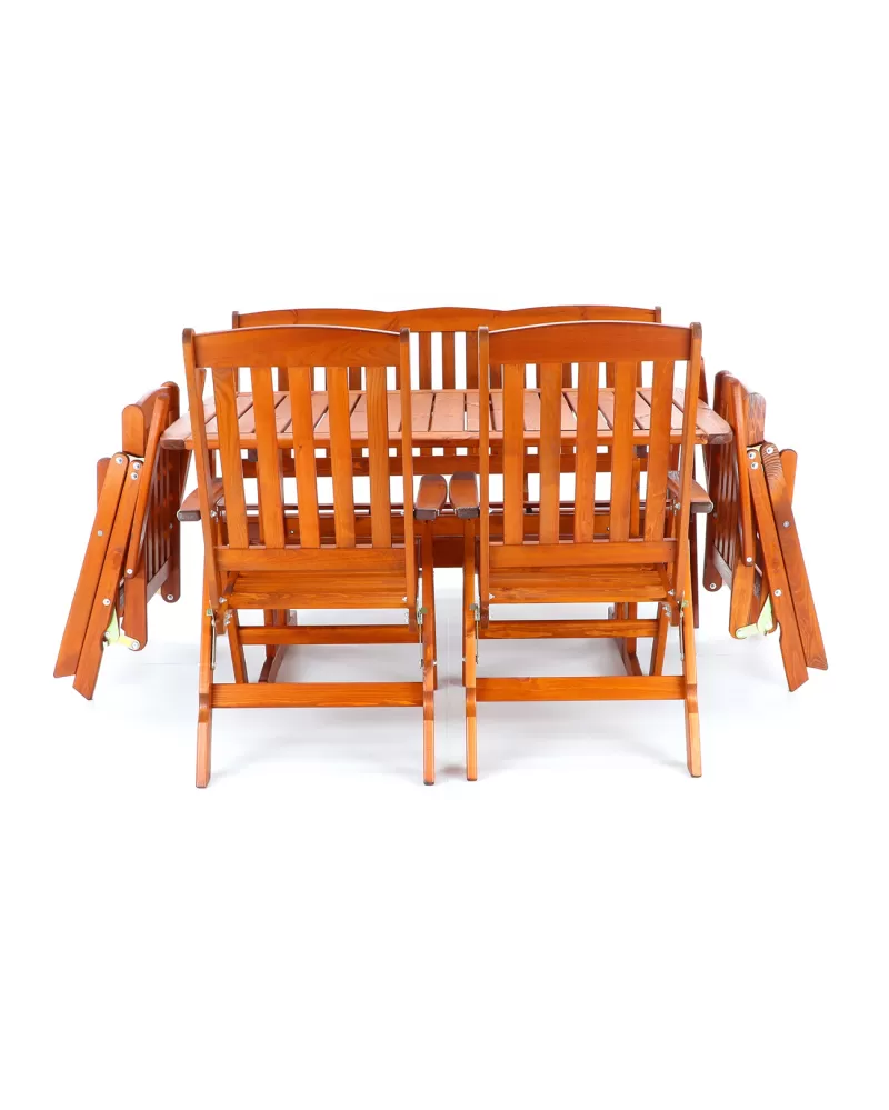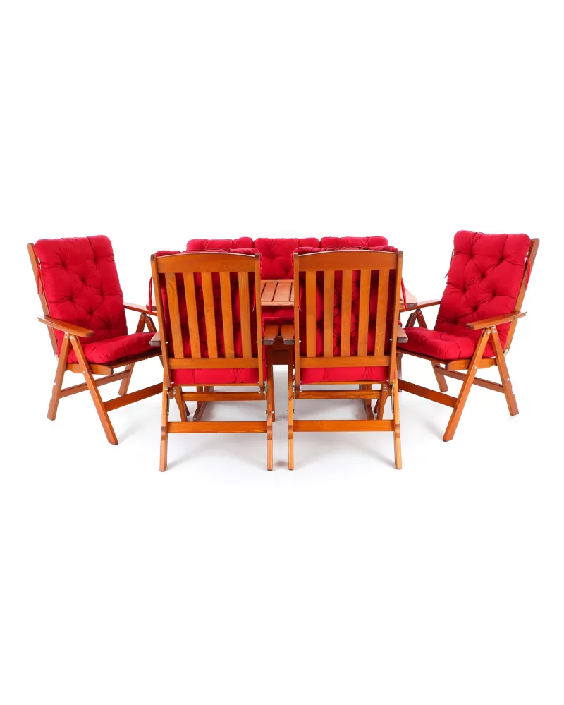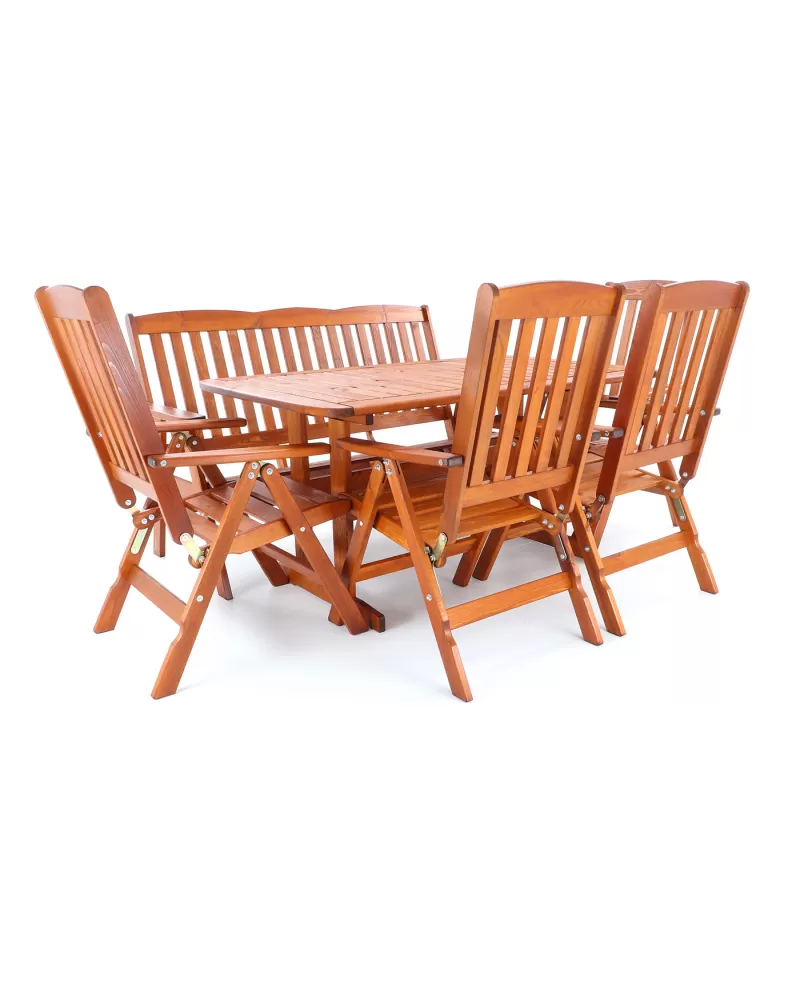 • Luxusní masivní stolová sestava čtyř polohovacích křesel, jedné polohovací lavice a stolu z odolného a trvanlivého dřeva severské borovice