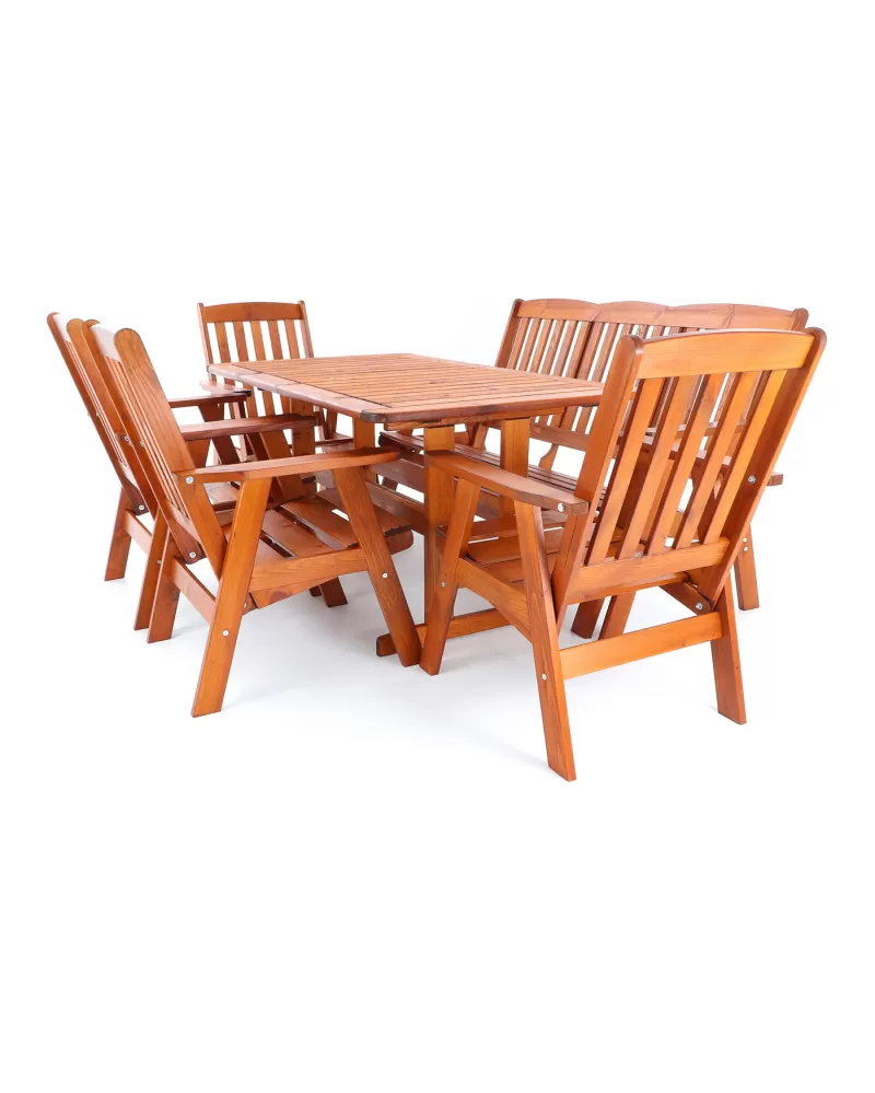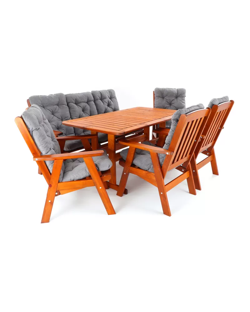 • Luxusní masivní stolová sestava čtyř polohovacích křesel, jedné polohovací lavice a stolu z odolného a trvanlivého dřeva severské borovice