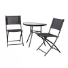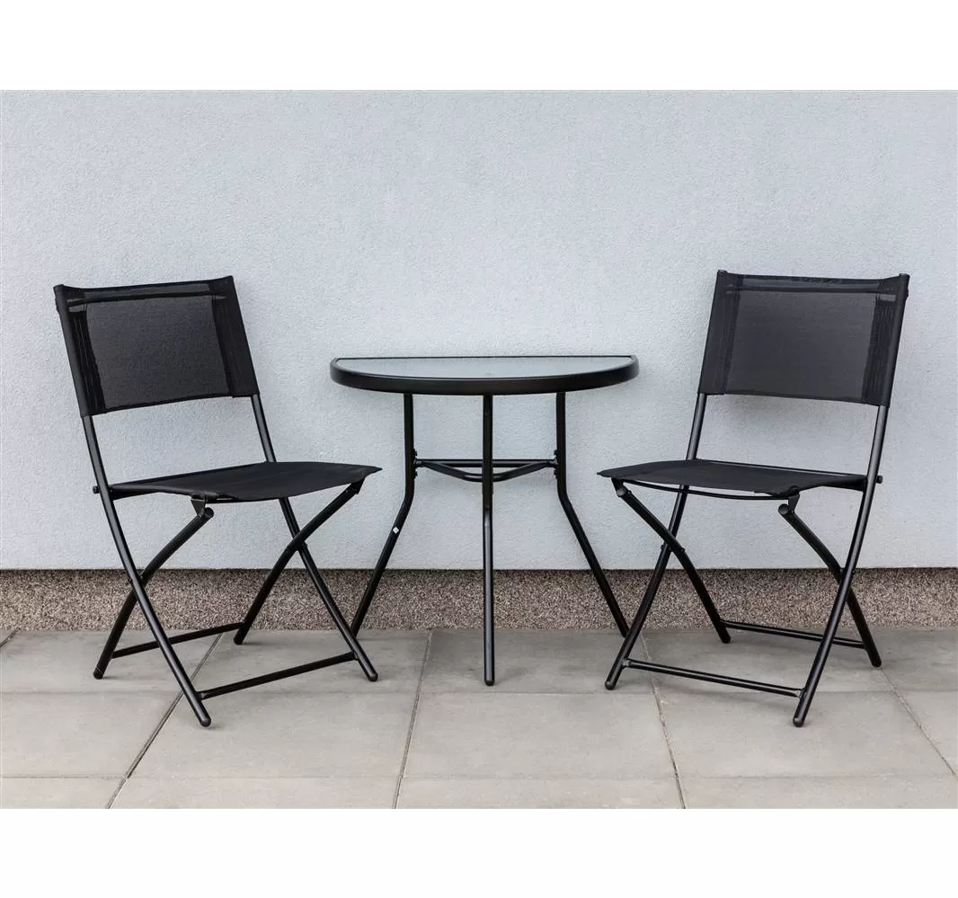 • 3dílný kovový balkónový set obsahuje: 1 x půlkruhový stůl s prosklenou vrchní deskou o rozměru 70 x 40 x 63 cm a 2 x skládací židle s textilenovým výpletem 2x1 o rozměru 55 x 45,5 x 78 cm