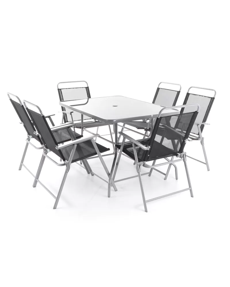 • Stolová sestava VeGAS MARIA 6 KOMPLET se skládá ze 6-ti pohodlných skládacich křesel a stolu z hliníkovo-ocelových profilů povrchově dokončené komaxitovou úpravou a slunečníku o průměru 200 cm