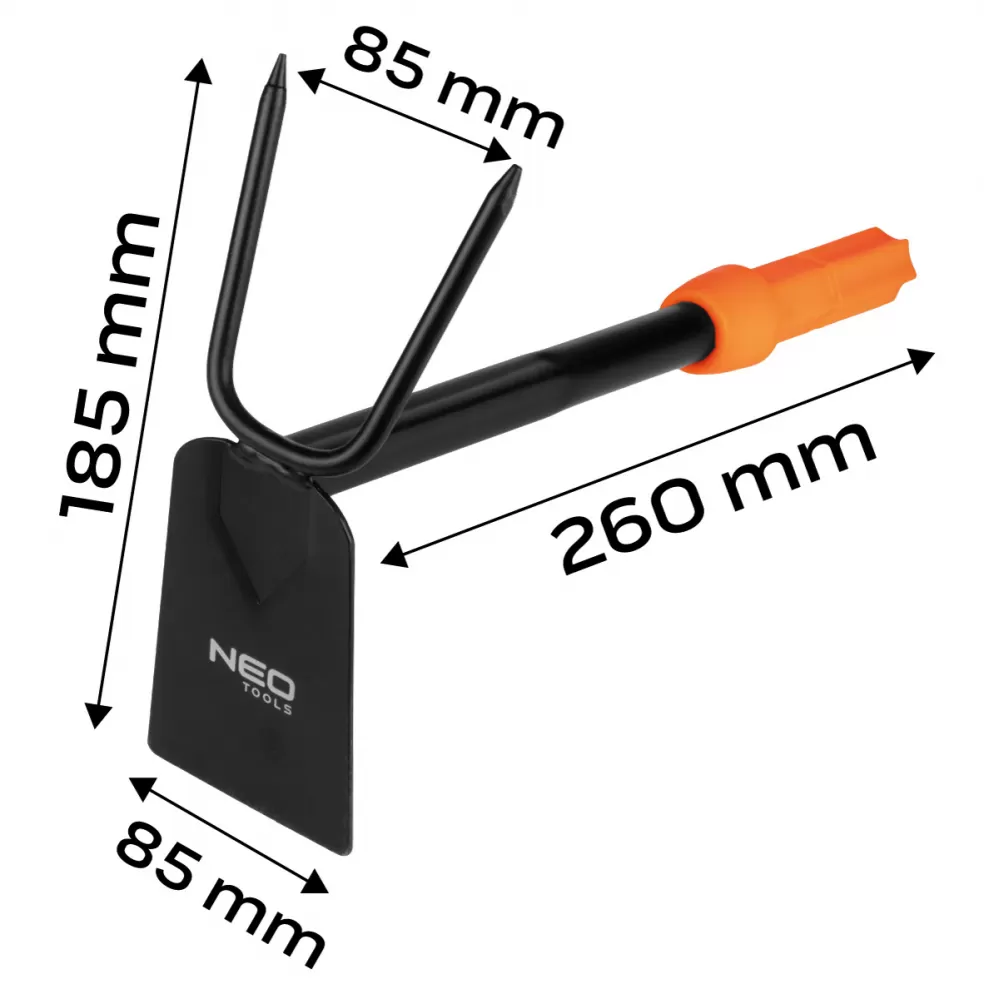 Malá oboustranná motyčka o délce 260 mm, výšce 185 mm a šířce pracovní části 85 mm. Vyrobena z robustní uhlíkové oceli, s PP nástavcem.