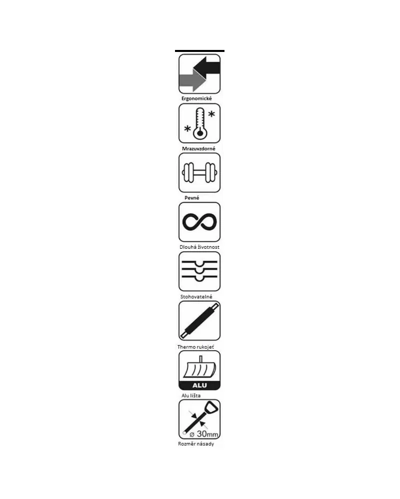 • Pracovní část hrabla je vyrobena z vysoce teplotně i mechanicky odolného PP plastu s odolností až -32oC, navíc zakončeného hliníkovou lištou