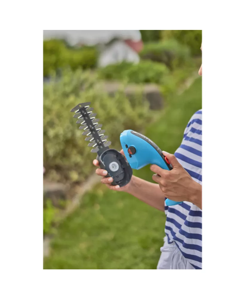 • Nože můžete rychle a snadno vyměnit stisknutím tlačítka a proměnit tak nůžky na trávu na nůžky na keře.