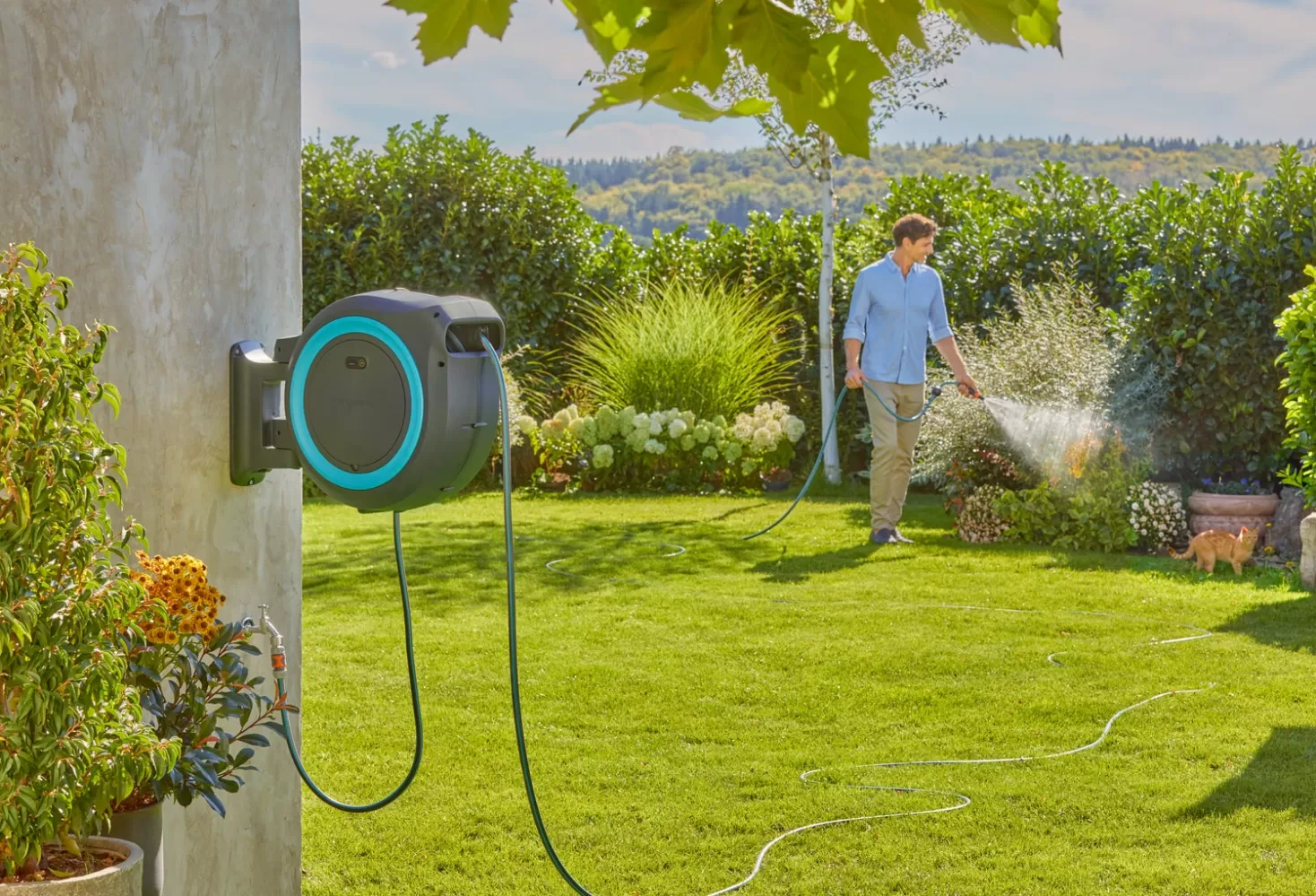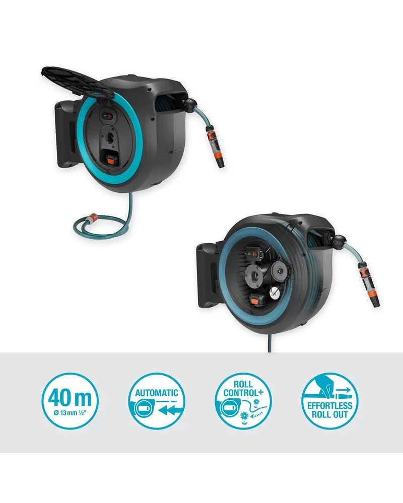 • Zahradní hadice o délce 40 m má na konci dálkové ovládání, kterým lze stisknutím tlačítka aktivovat bateriový naviják. Díky integrovanému vedení hadice a funkci RollControl+ se hadice navíjí jemně a bez nepříjemného zauzlování nebo překrucování. Na posledních 2 metrech zatahování je rychlost snížena, aby nedošlo k poškození předmětů. Systém ukládání hadice zajišťuje pohodlné a kontrolované zavlažování.