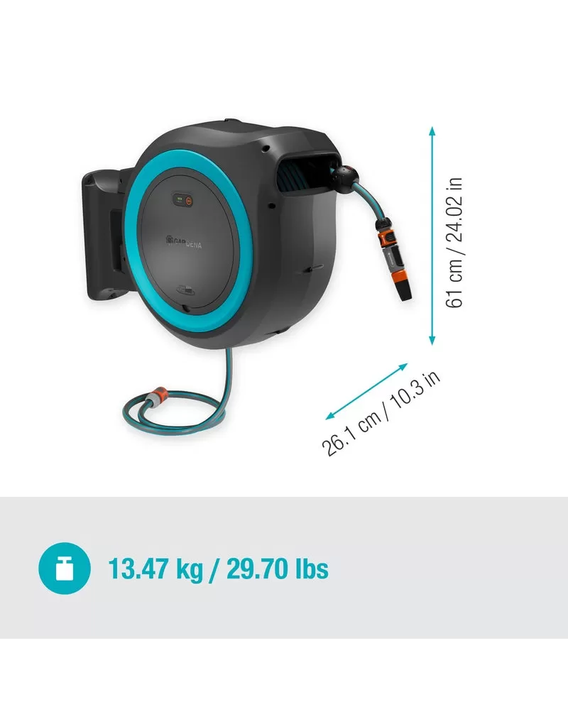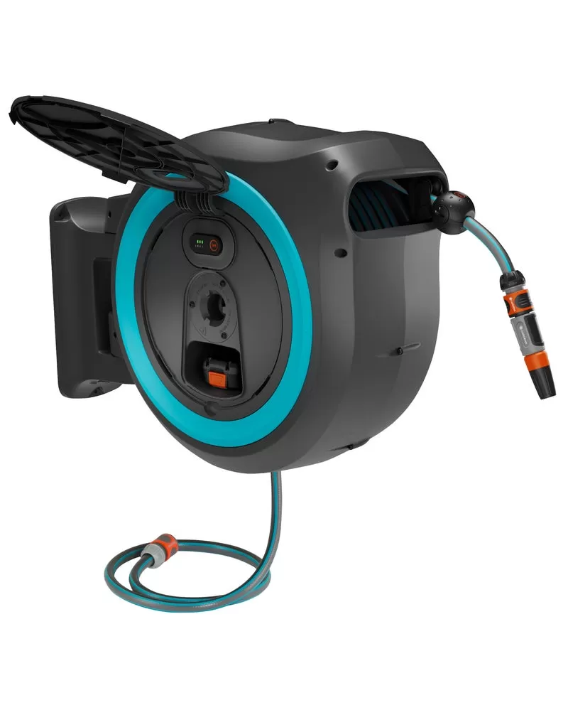 GARDENA nástěnný box na hadici PowerRoll XXL - sada Ready-To-Use zajišťuje inovativní a pohodlné zavlažování díky technologii dobíjecího akumulátoru pro automatické svinování.