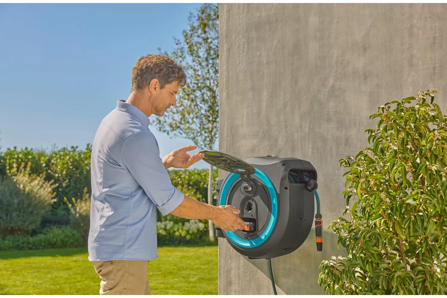 • Úložný box umožňuje velký dosah a prostorově úsporné umístění na stěně. Box lze na nástěnném držáku otáčet v úhlu 180°, aby bylo možné snadno dosáhnout na libovolné místo na zahradě a při tom se hadice nezlomila. Díky držáku na stěnu nabízí praktický úložný prostor, kde lze snadno uložit postřikovače, sprchy a další zavlažovací příslušenství.