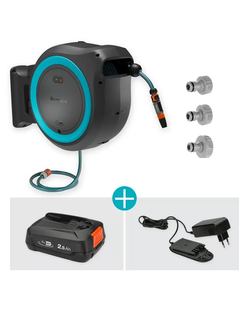 • 18V POWER FOR ALL 1,5 Ah akumulátor integrovaný v sadě automaticky navíjí hadici na vodu stisknutím tlačítka. Stačí vložit baterii do nástěnného boxu na hadici a spustit zasouvání na konci hadice, případně stisknout tlačítko pro navíjení na krytu boxu, čímž se hadice kontrolovaně svine.
