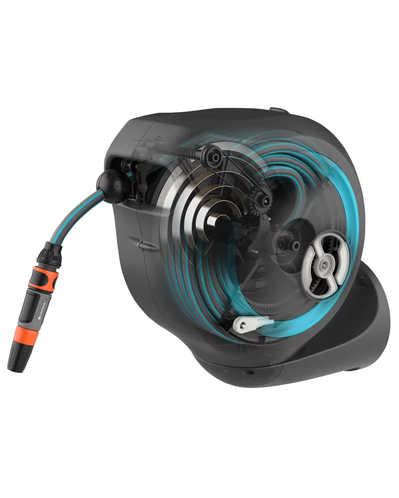 • Lehkým zatažením za konec hadice uvolníte zajišťovací mechanismus a zabudovaná ocelová pružina spolehlivě a automaticky navine hadici za vás