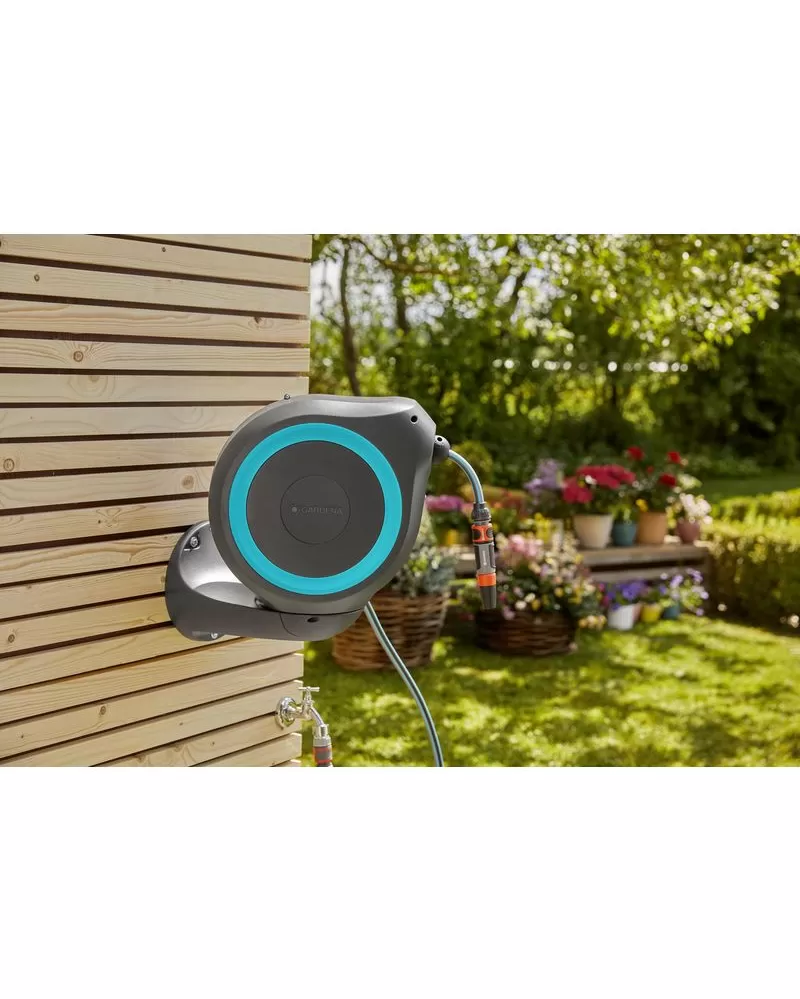 • Tento kompaktní box se jednoduše připevní na zeď domu a kromě bezpečného uložení hadice vám usnadní navíjení hadice po zavlažování