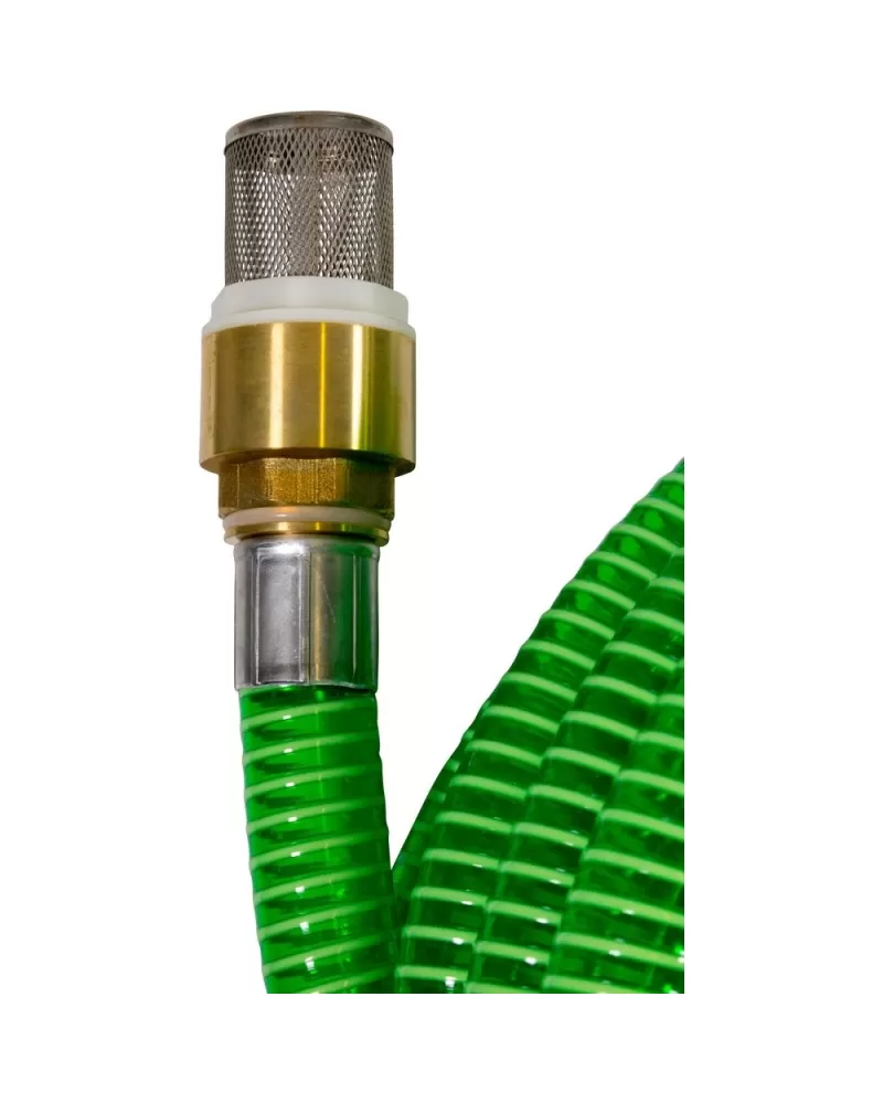 • Vysoce odolné proti podtlaku (během sání se profil hadice nezužuje), včetně sacího koše z nerezové oceli, mosazné zpětné klapky (zkrácené intervaly mezi opakovaným nasáváním) a spojky s vnějším/vnitřním přípojným závitem (upevnění hadicovými sponami)